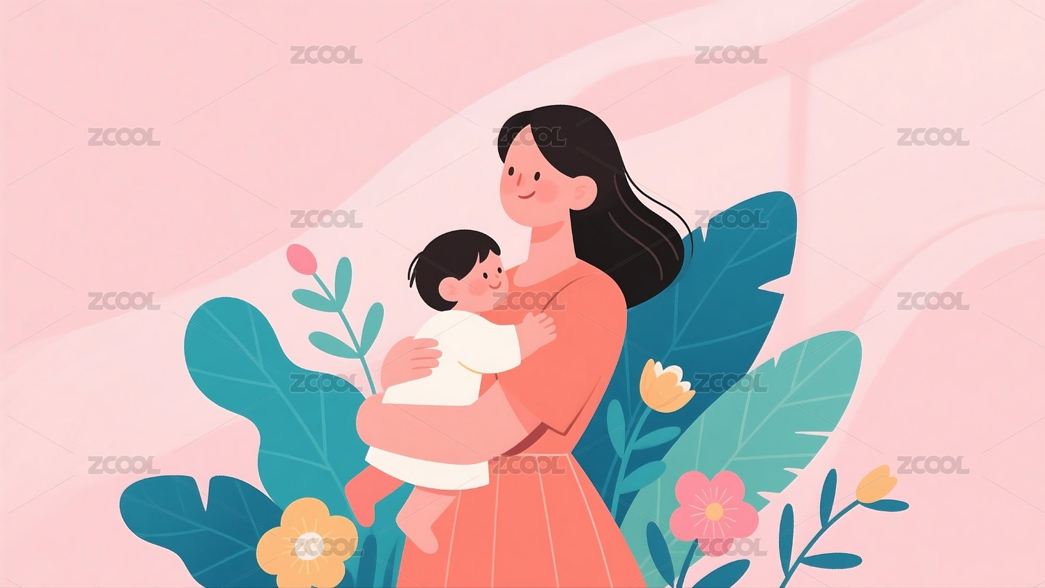母亲怀抱着小孩鲜花环绕母亲节温馨插画
