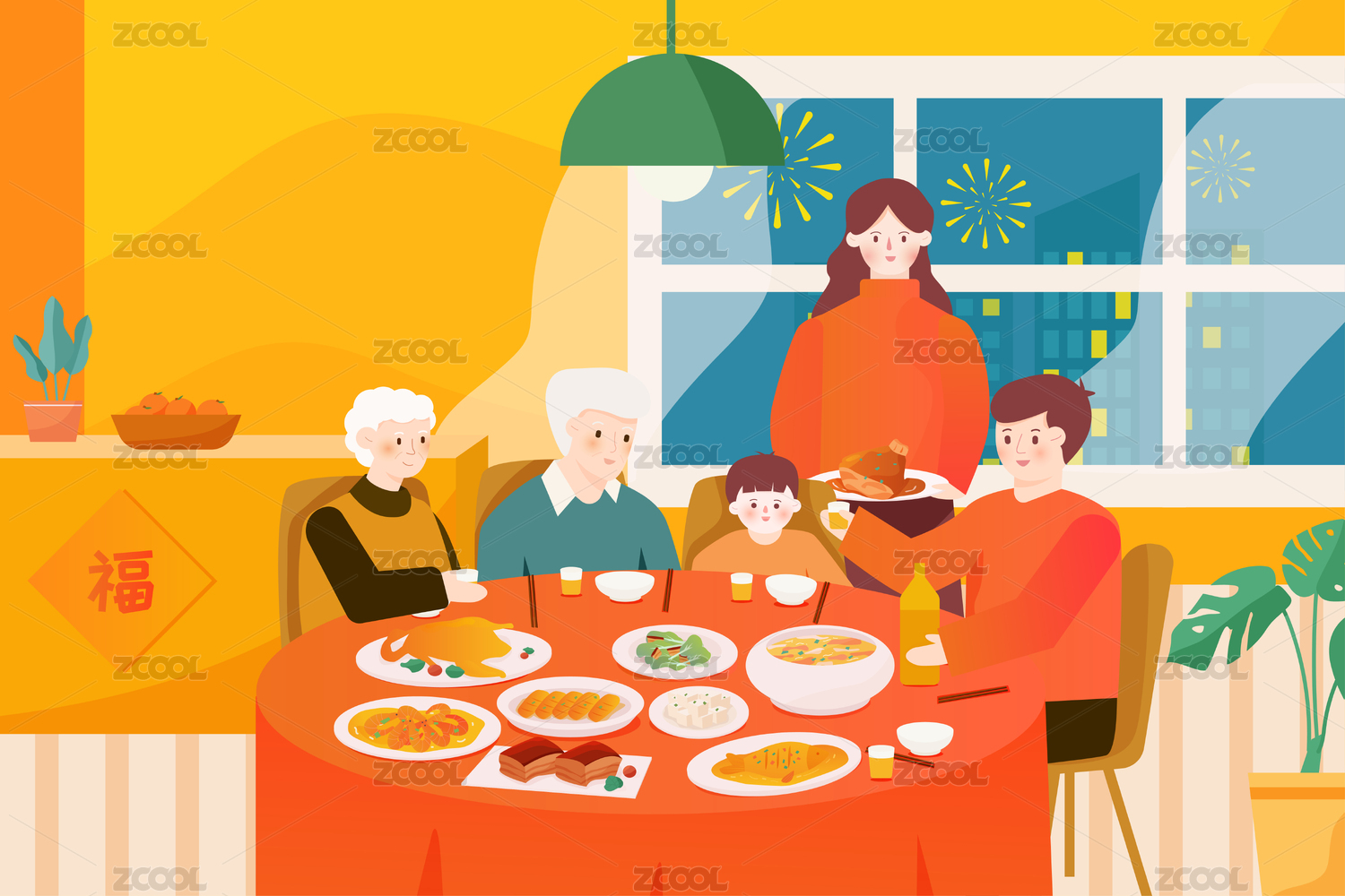 团圆饭年夜饭全家团聚吃饭扁平插画