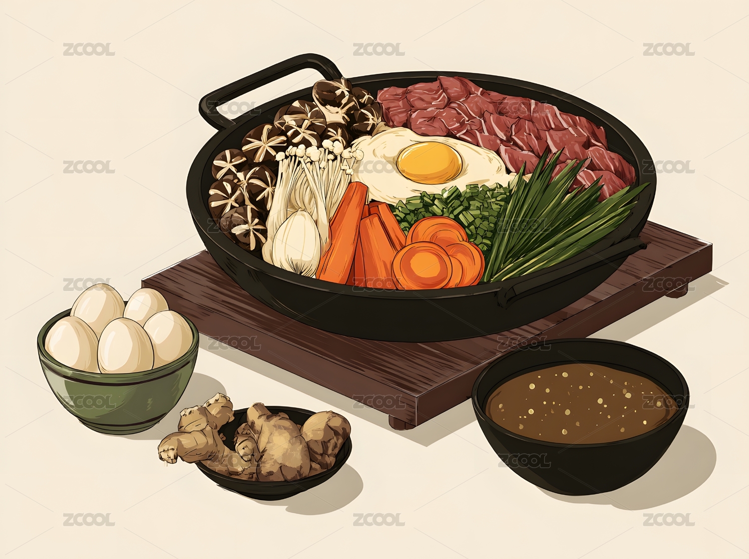 韩式石锅拌饭搭配小菜摆盘美食插画