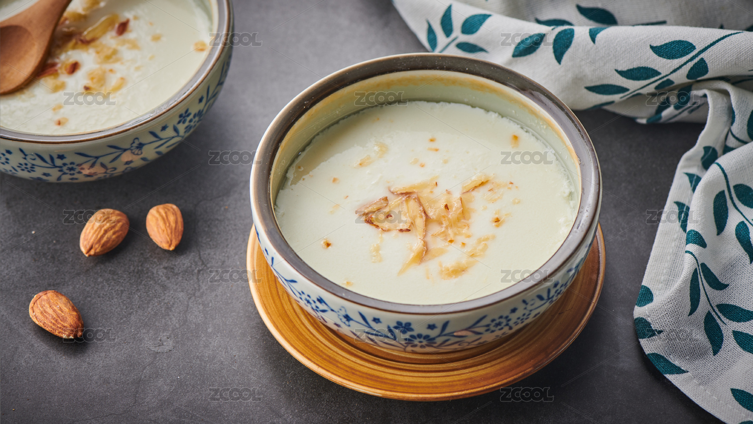 桌面上的碗里美味可口的牛奶荞麦麦片