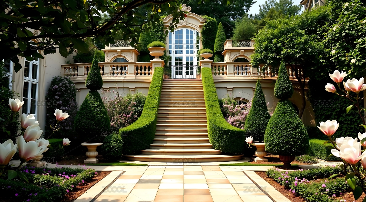 **优雅庭院绿意盎然花团锦簇石阶通幽**