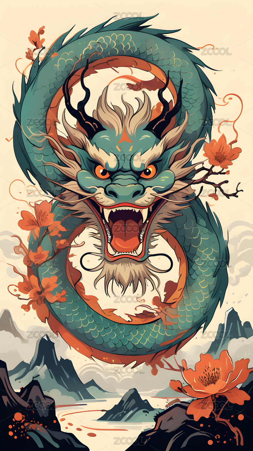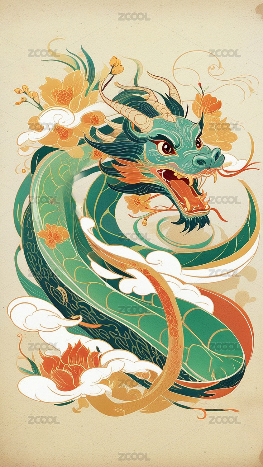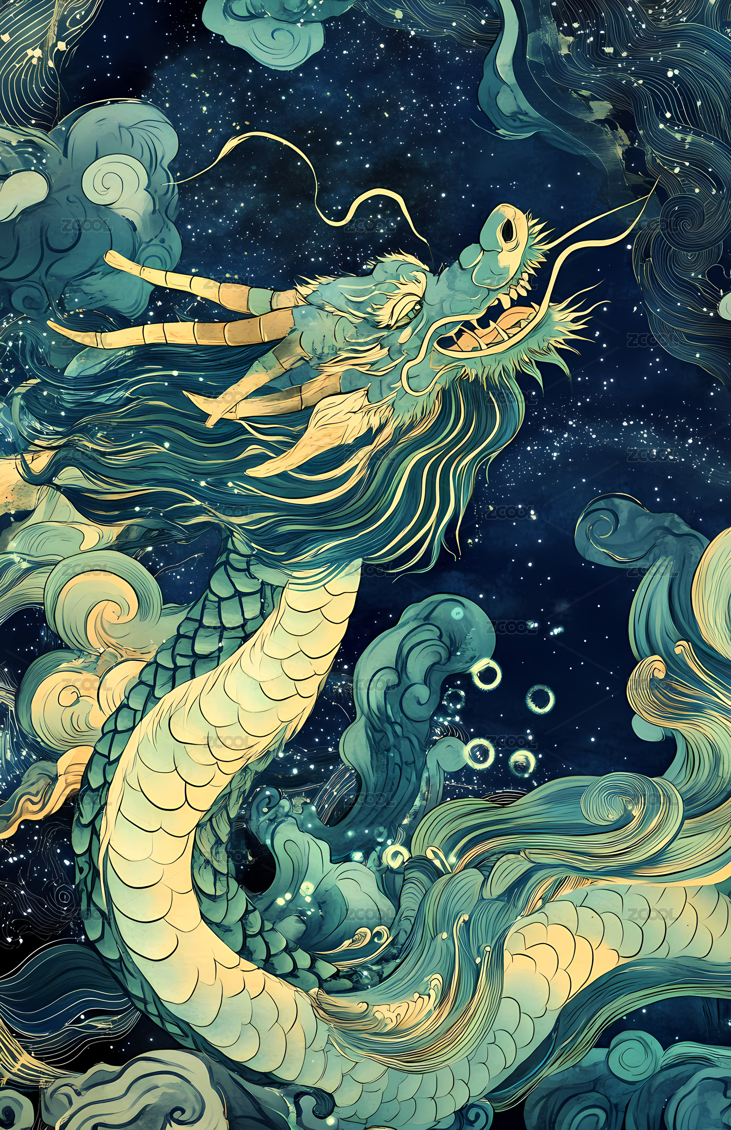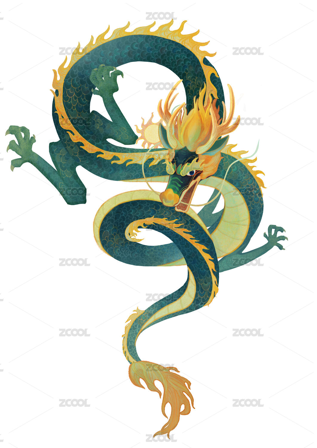 青龙,神兽,白云,树木,夕阳,青色,绿色,画卷,树
