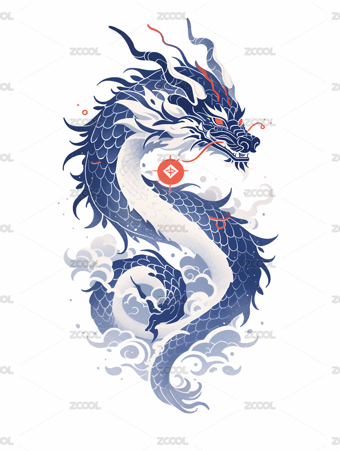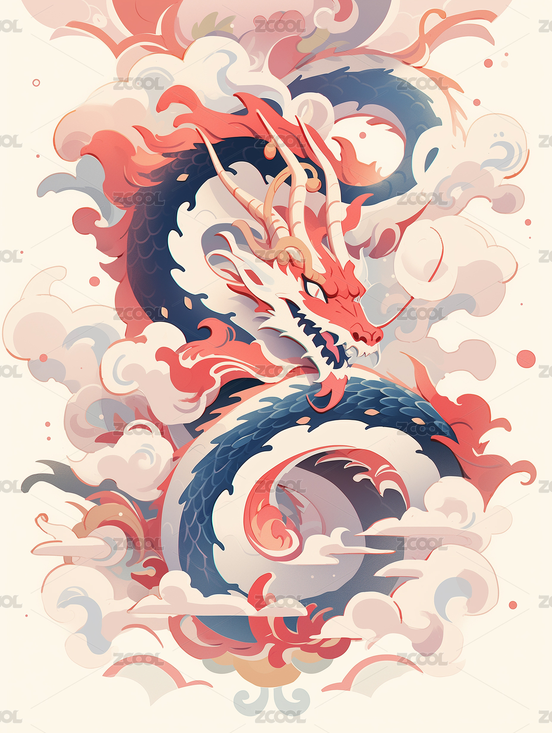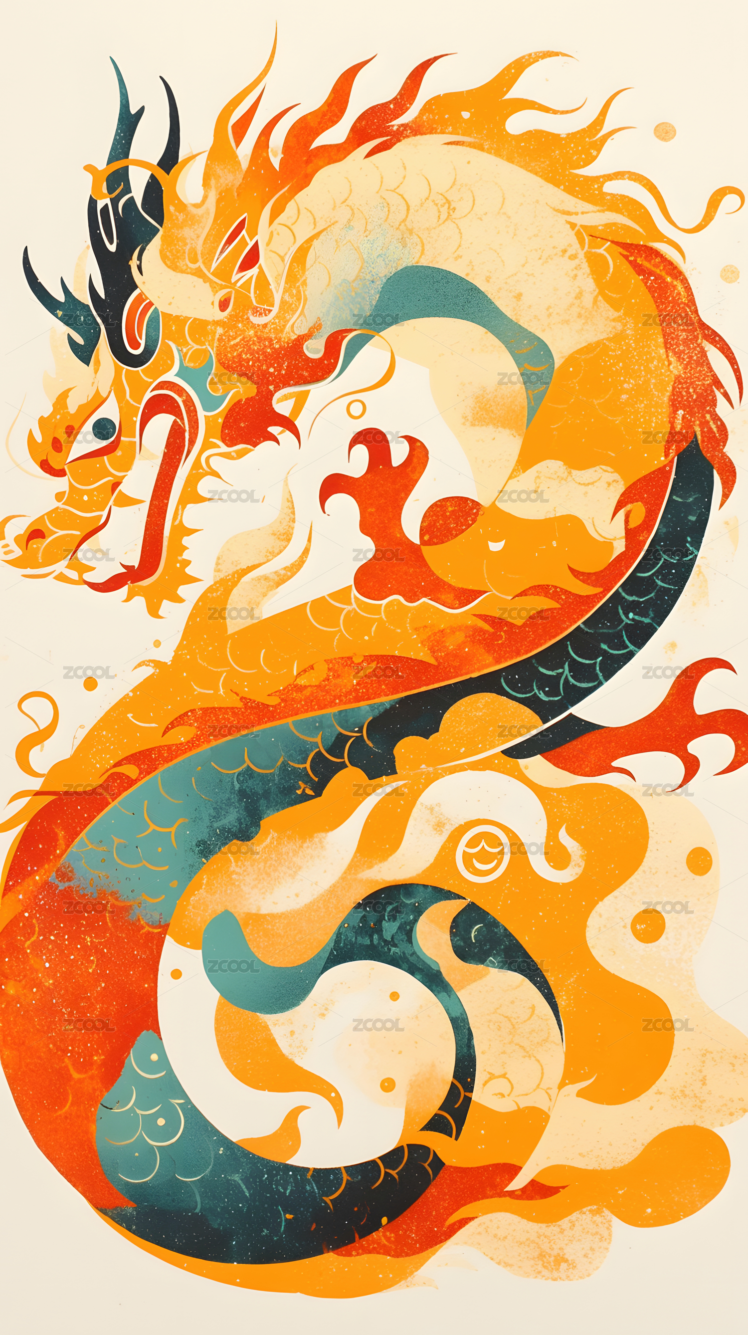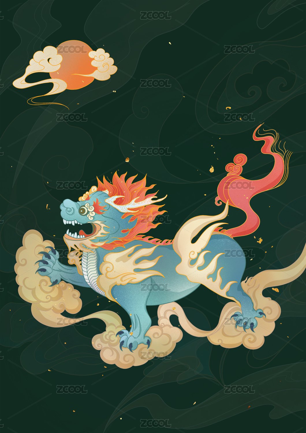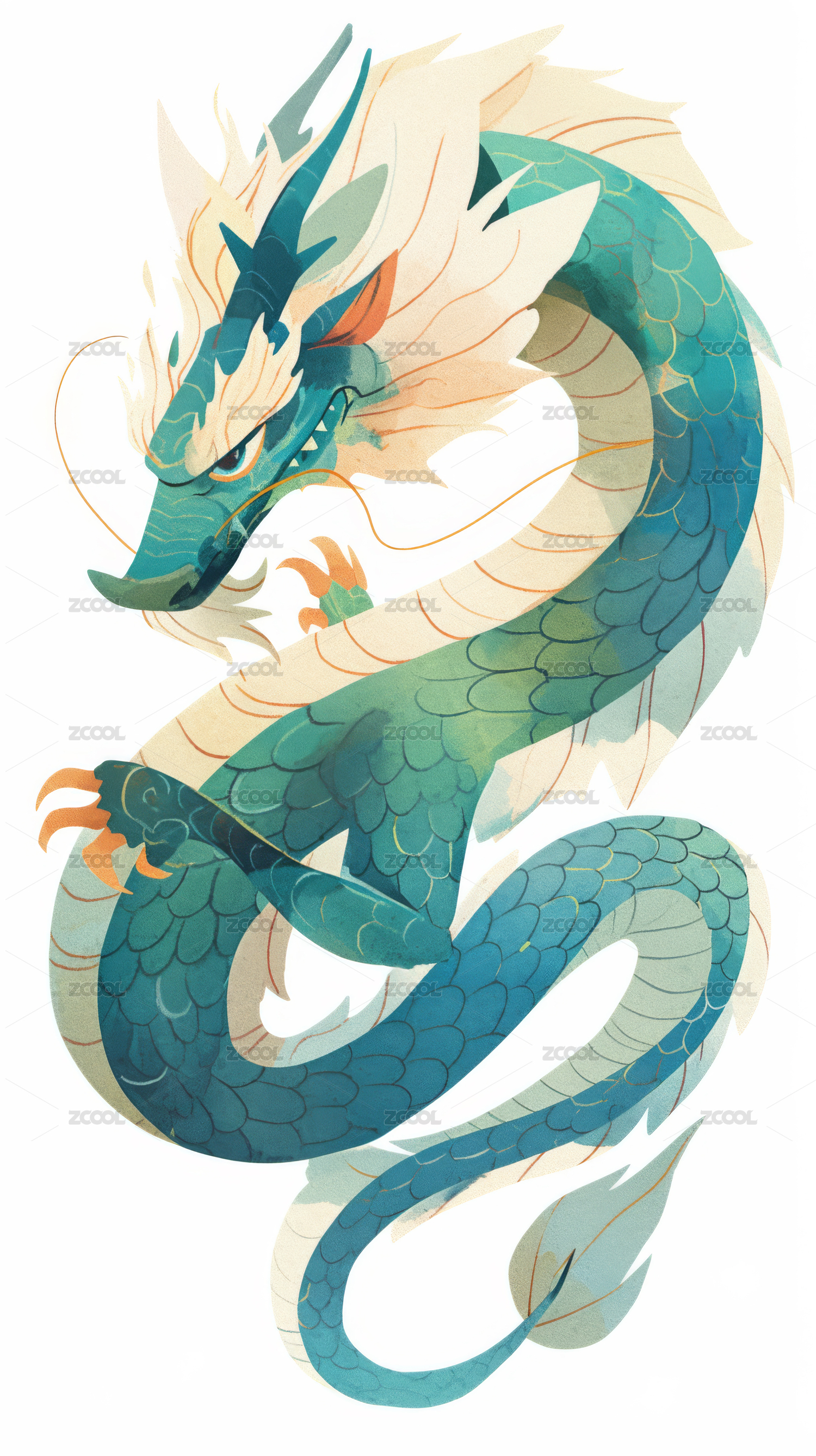 青龙,神兽,白云,树木,夕阳,青色,绿色,画卷,树