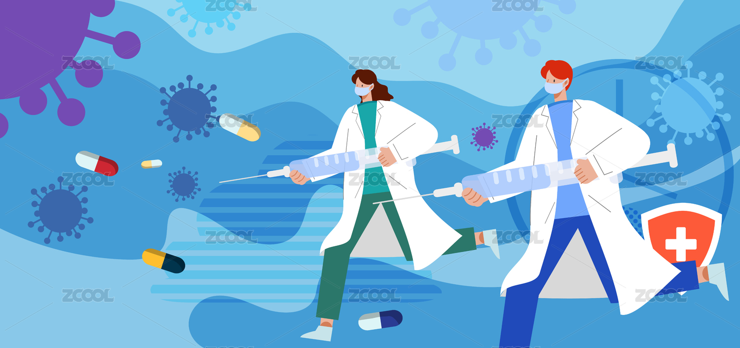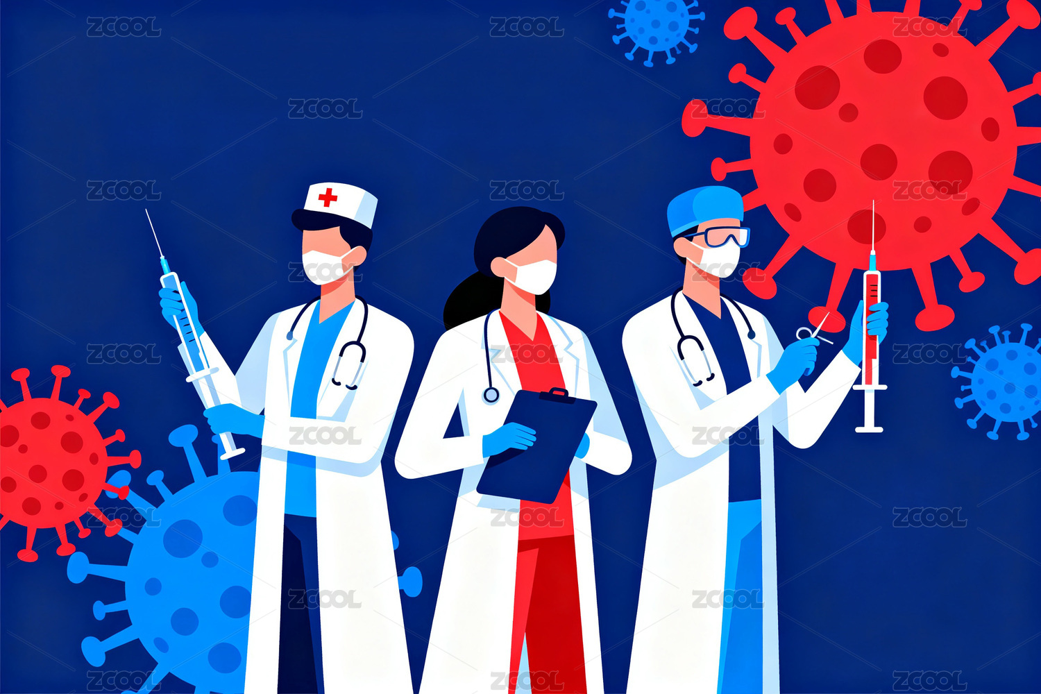 一个拿着盾牌针筒的医生和药箱疫苗等