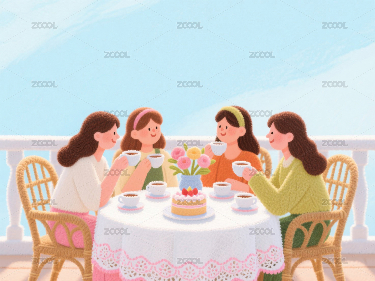 假日一起吃饭的女孩们 聚餐创意插画