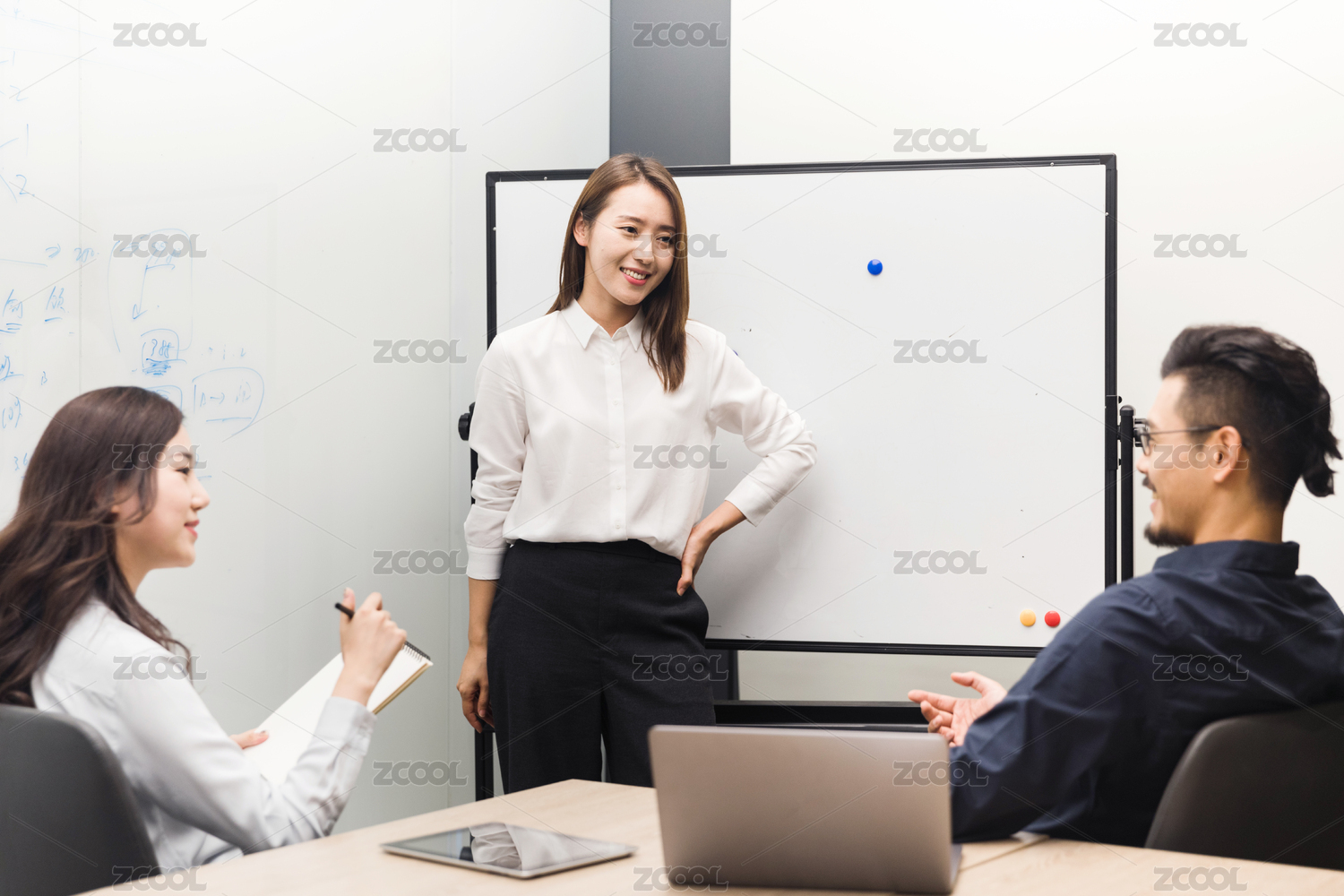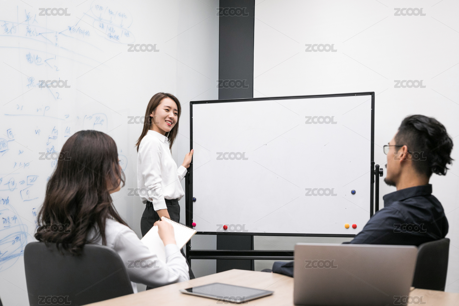 年轻漂亮的女商人公司会议期间提出了新的法人情况下计划在白板上所有的合作伙伴。