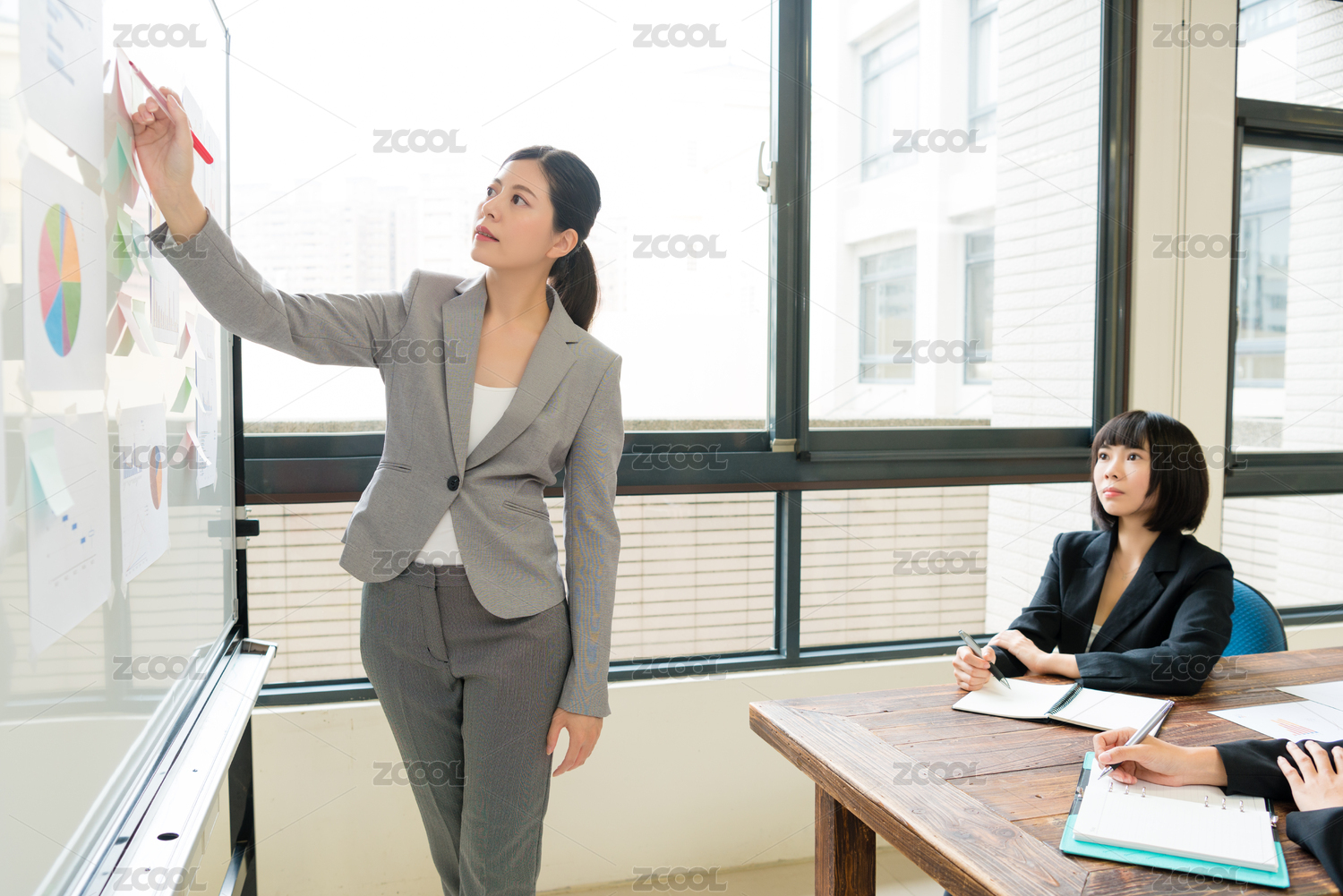 在文档优雅迷人的女上班族经理写作,当她与同事使用办公白板会议解释公司市场分析报告。