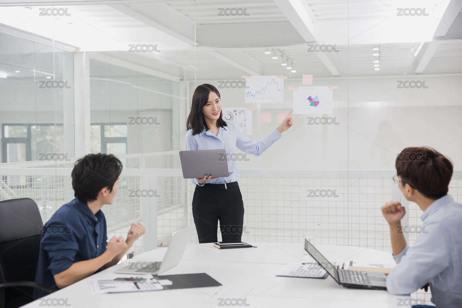 年轻漂亮的女公司业务经理看着员工怒发冲冠,她发现自己不参加会议报告时。