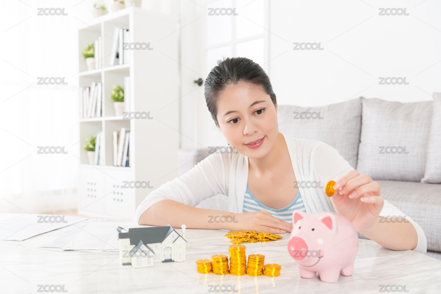 可爱的年轻女子在家里坐在客厅里和持有金币存钱到粉红色的储蓄罐购买新房子的家庭。