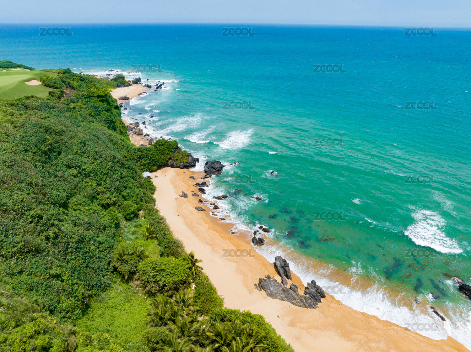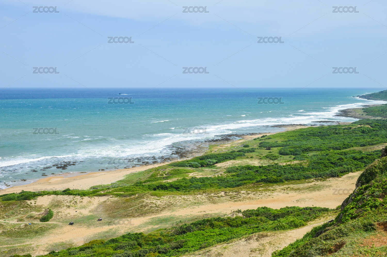 蓝色海洋的海水景色和著名登山丘陵山地景观照片覆盖晴朗的天空和白色的波没人管。