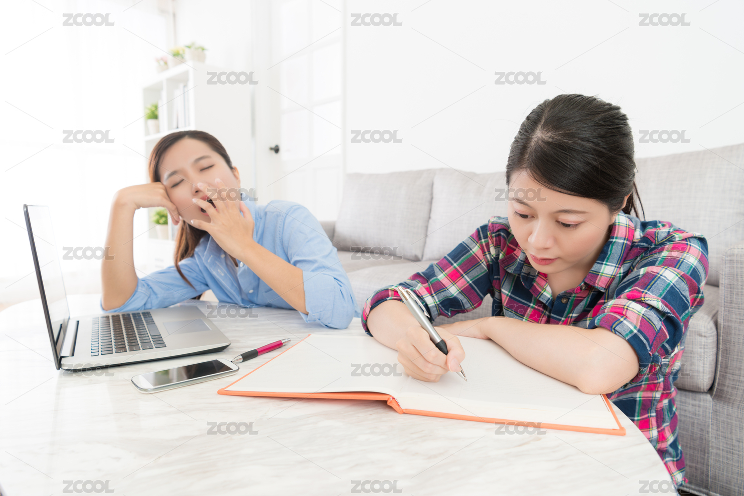 可爱甜美的学生做功课认真在家里,但她的朋友感到疲倦越来越打哈欠时,他们一起学习。