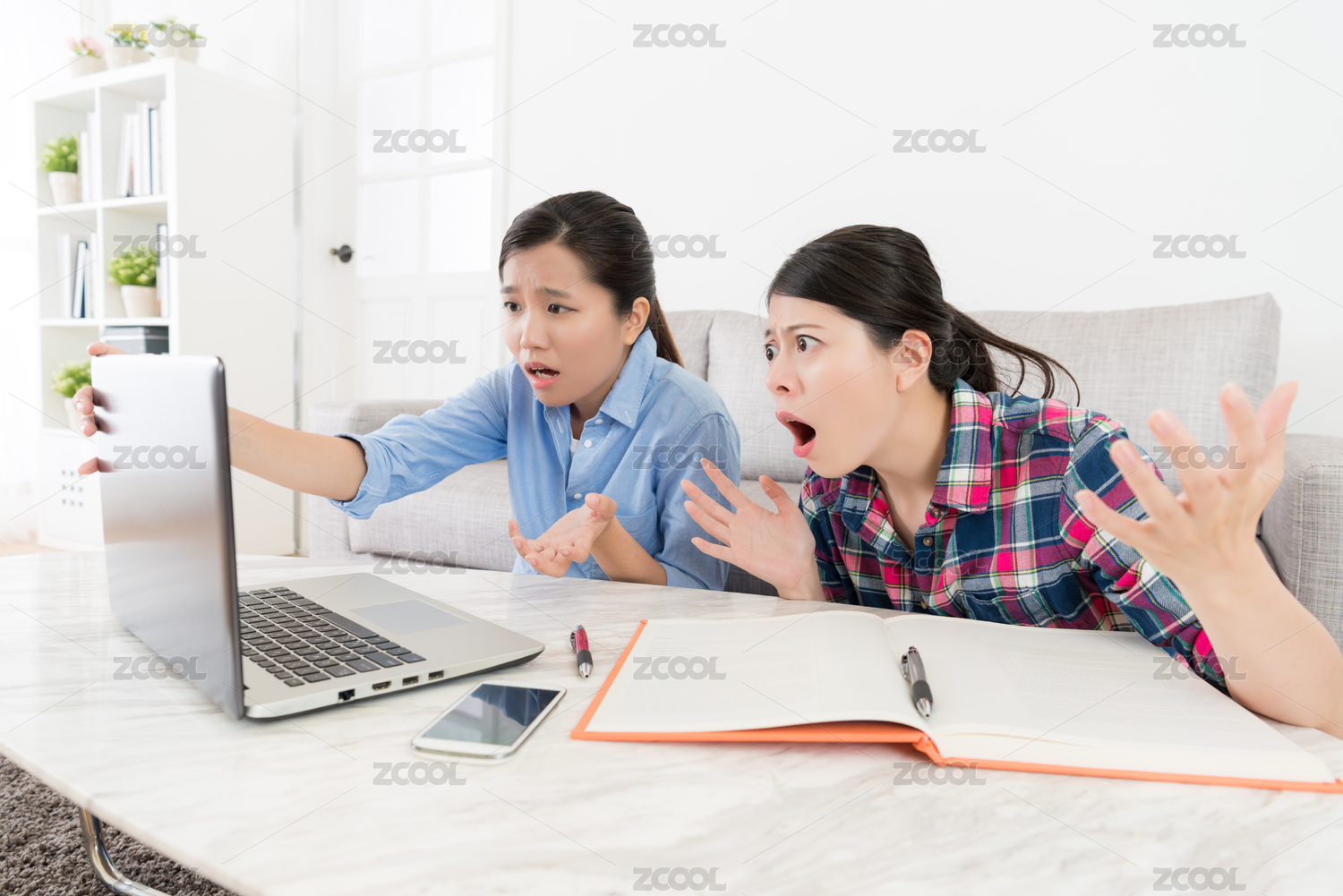 美丽年轻的女学生在家里一起学习寻找移动电脑坏了看屏幕感觉悲伤和震惊,因为他们的家庭作业丢失。