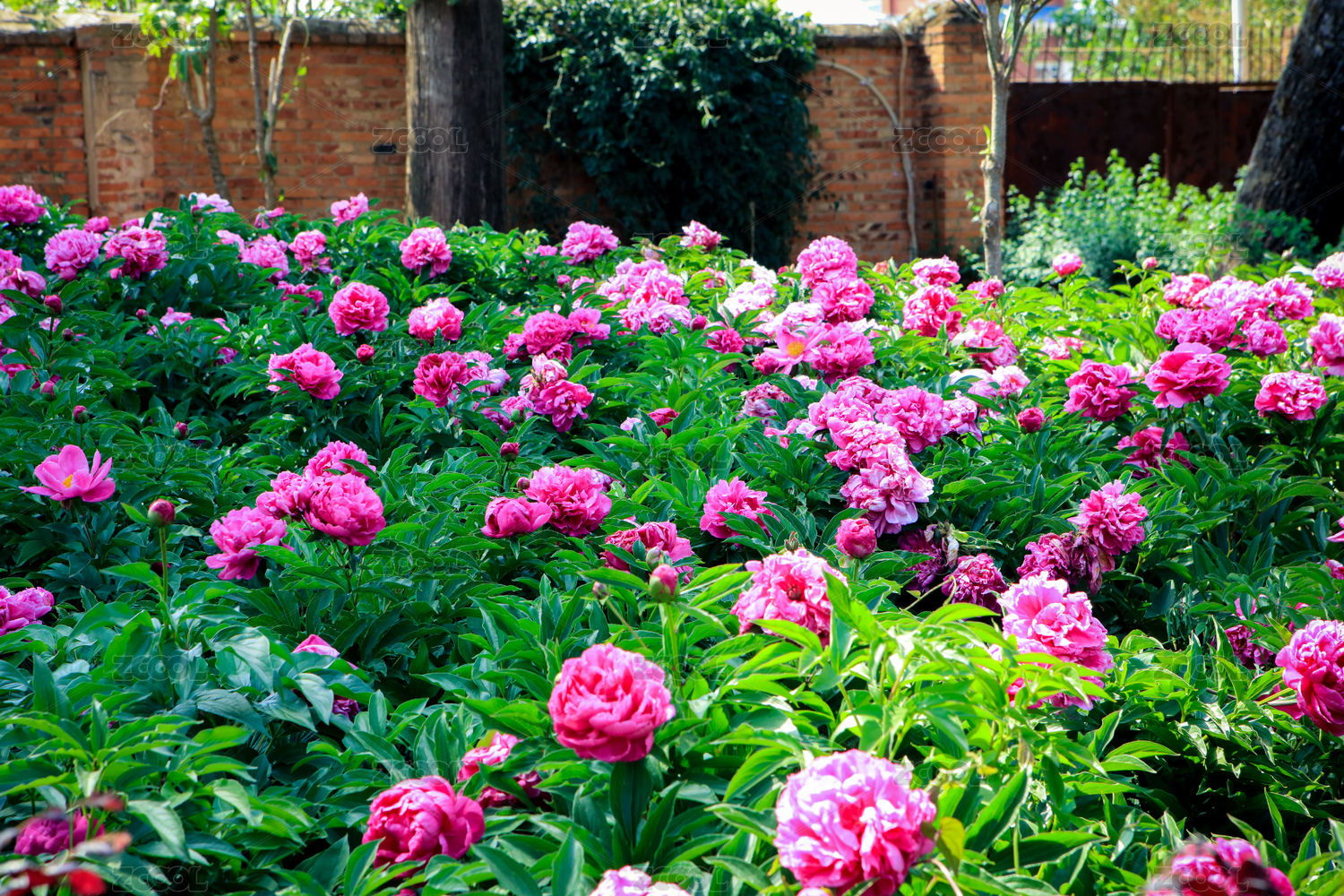 花园里盛开粉红色的牡丹花丛