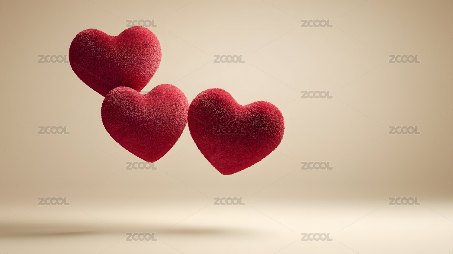 三颗蓬松红色爱心漂浮在米色背景上