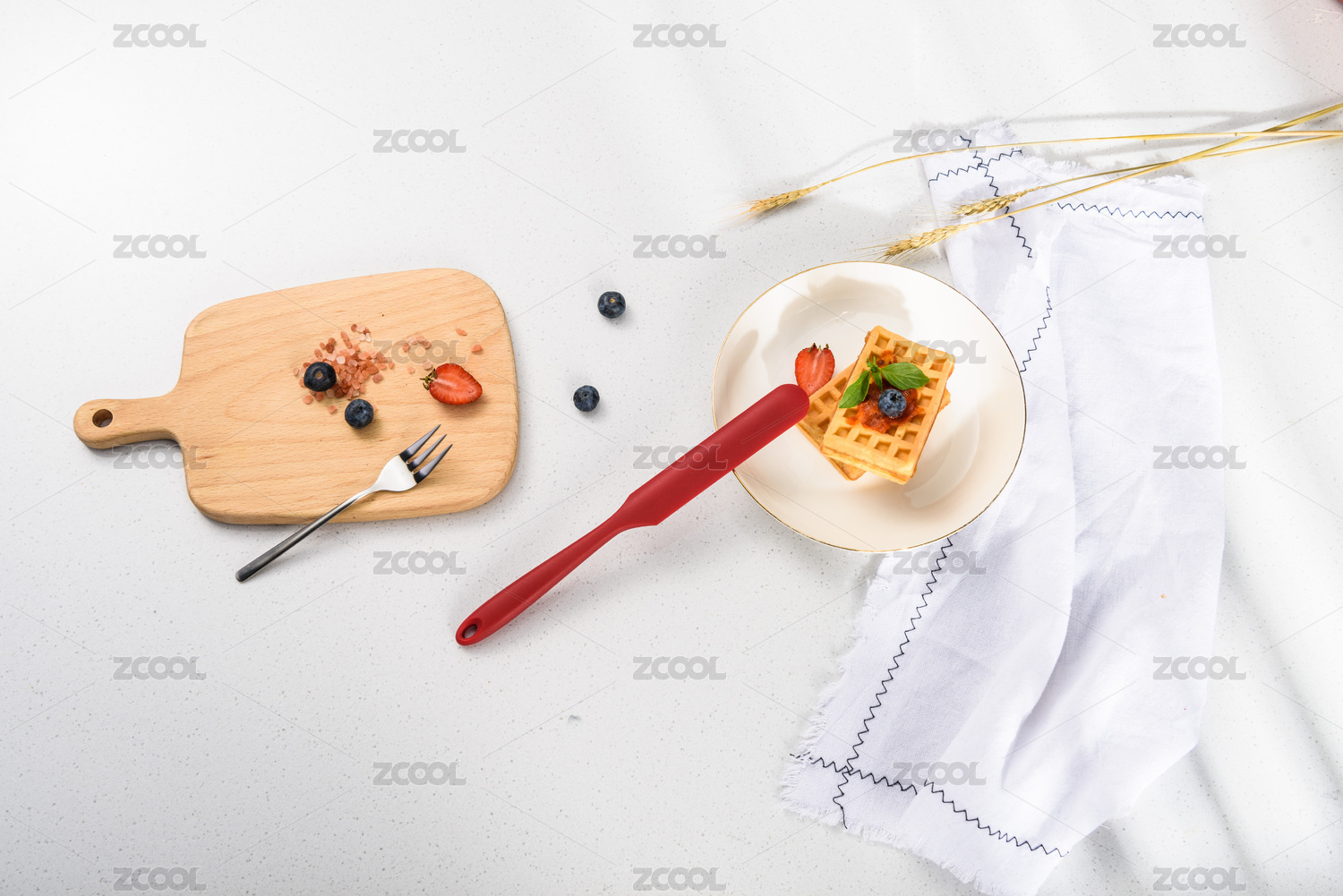 桌面上的硅胶刮刀叉子华夫饼碟子