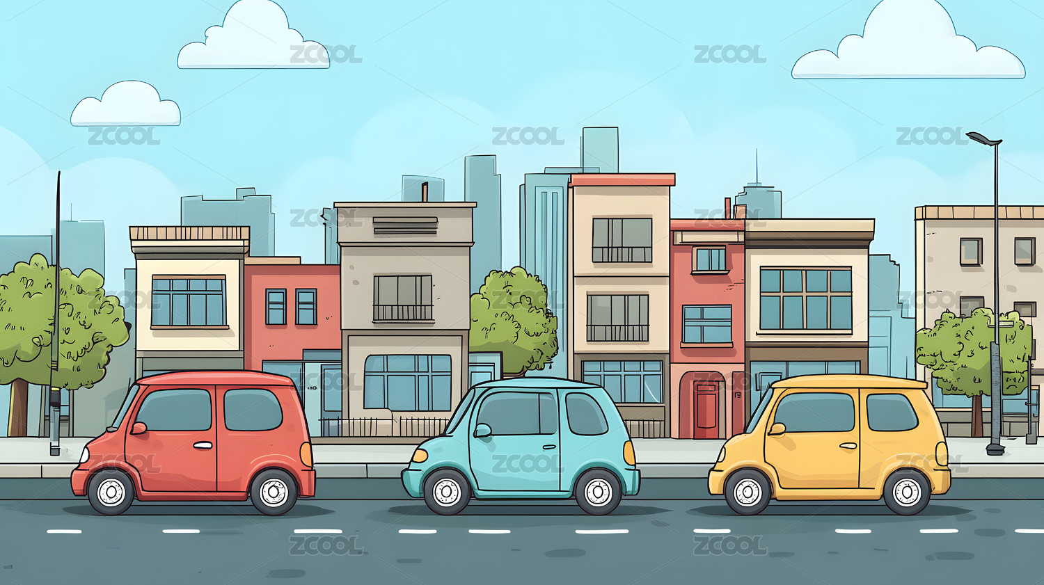 城市的道路上行驶着小汽车矢量插画