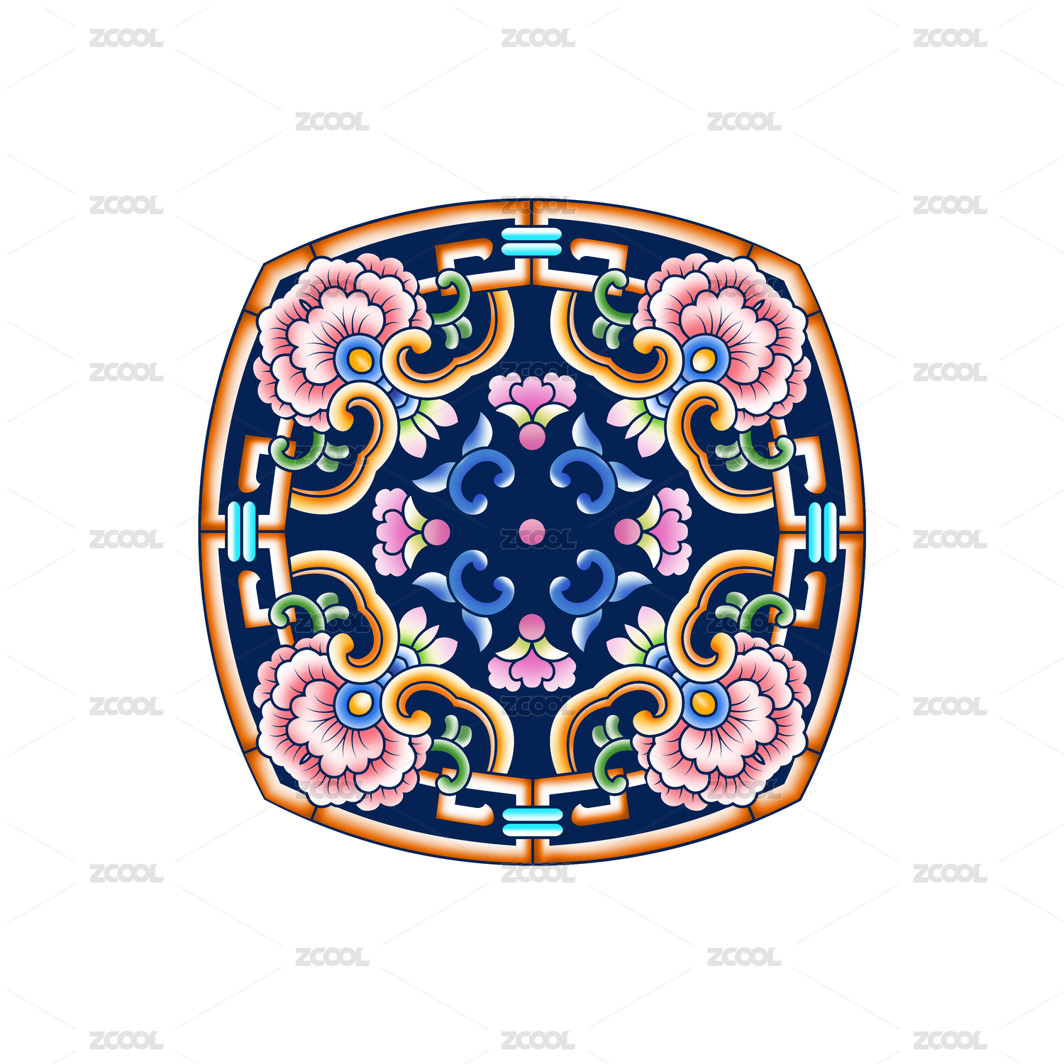 中国传统的彩色缠枝花纹圆形图案,白色背景