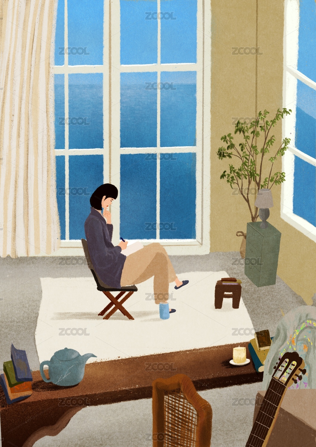 二十四节气小寒 下雪的冬天夜里 穿着红色衣服的女孩戴着帽子在温暖的室内看向窗外海报背景素材