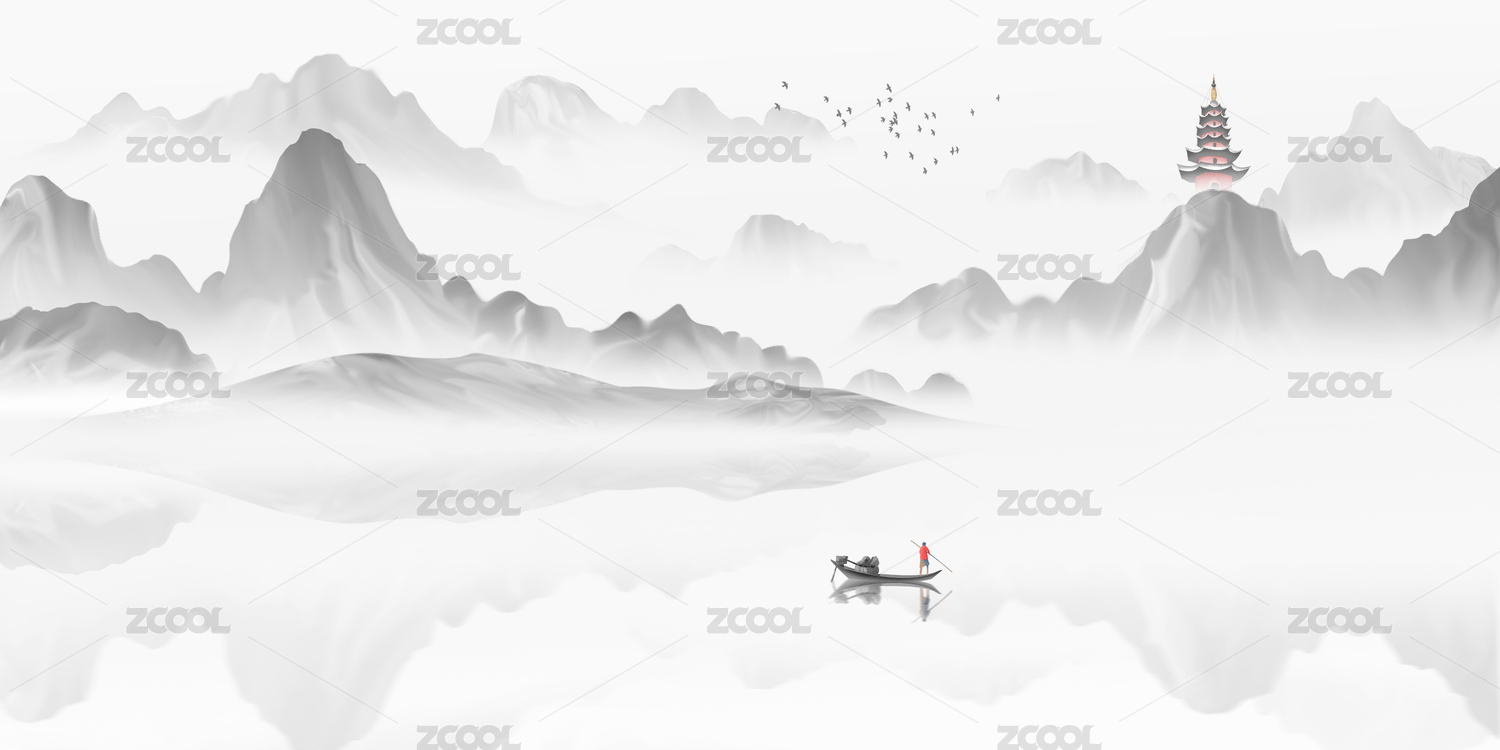 古建筑,新中式,水墨画,山水画,蓝色,艺术,山水,手绘,流行色,中国风