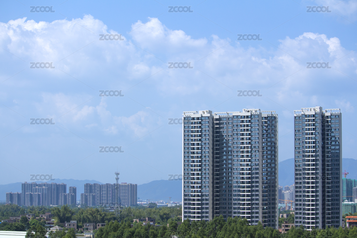 群山背景中的成都市温江区建筑风光