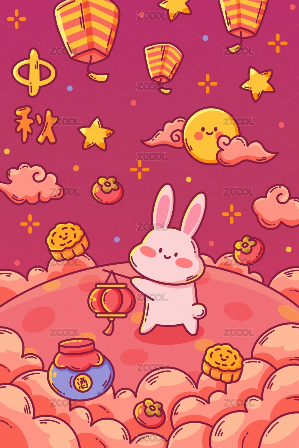 中秋节兔爷桂花月亮插画海报