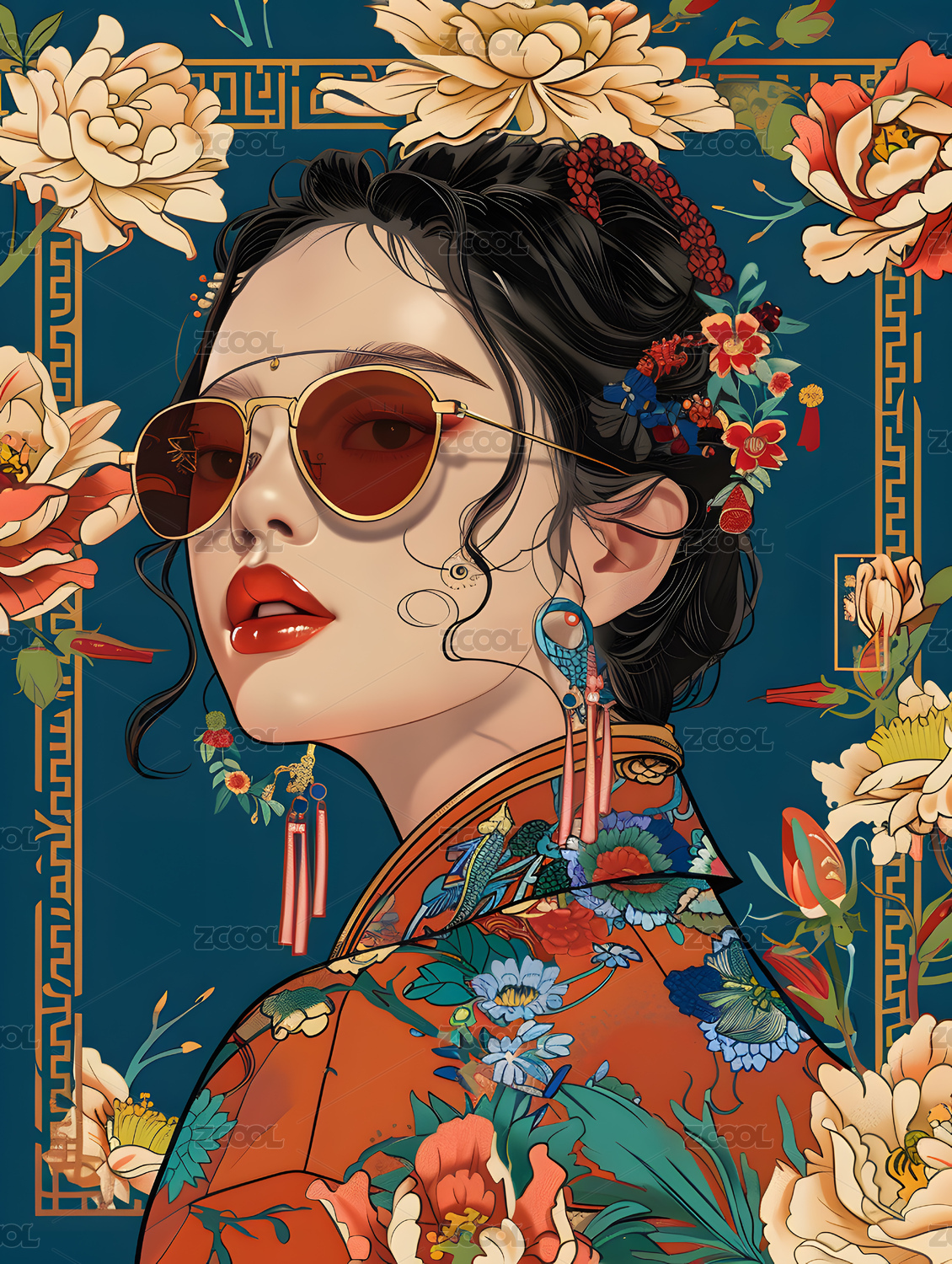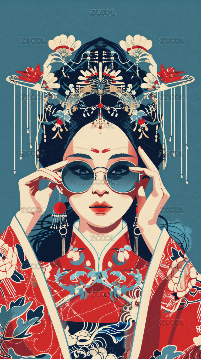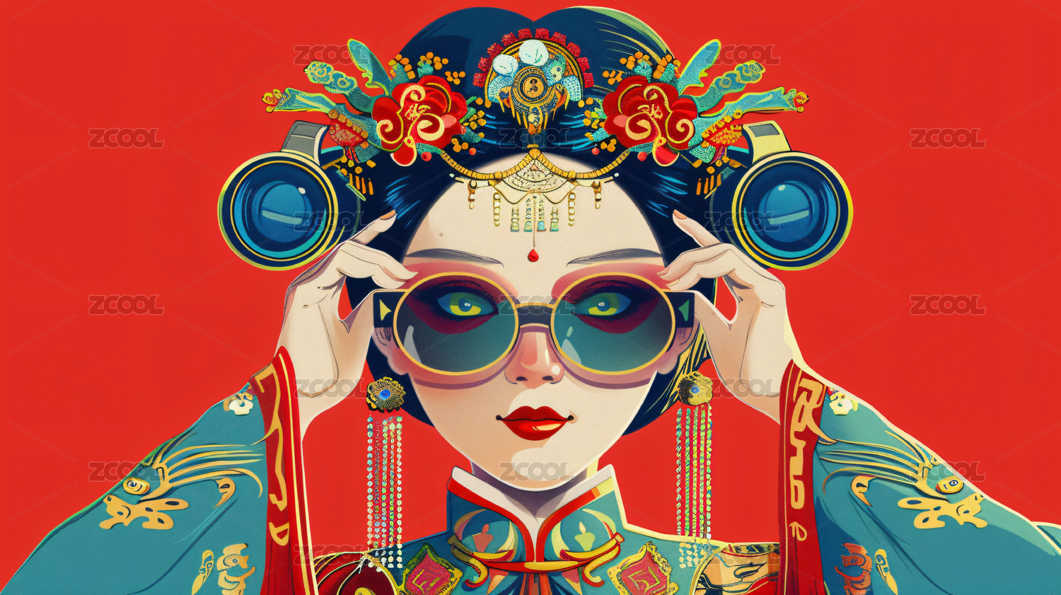 图像,AIGCFG,插画,红色,新中式风格,中国文化,国潮风,太阳镜,扇子,少女