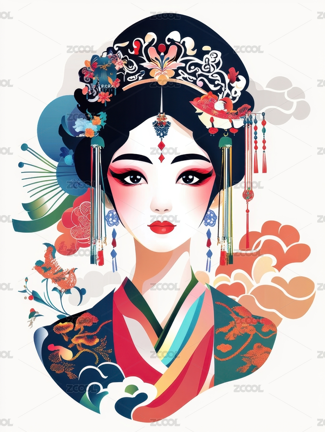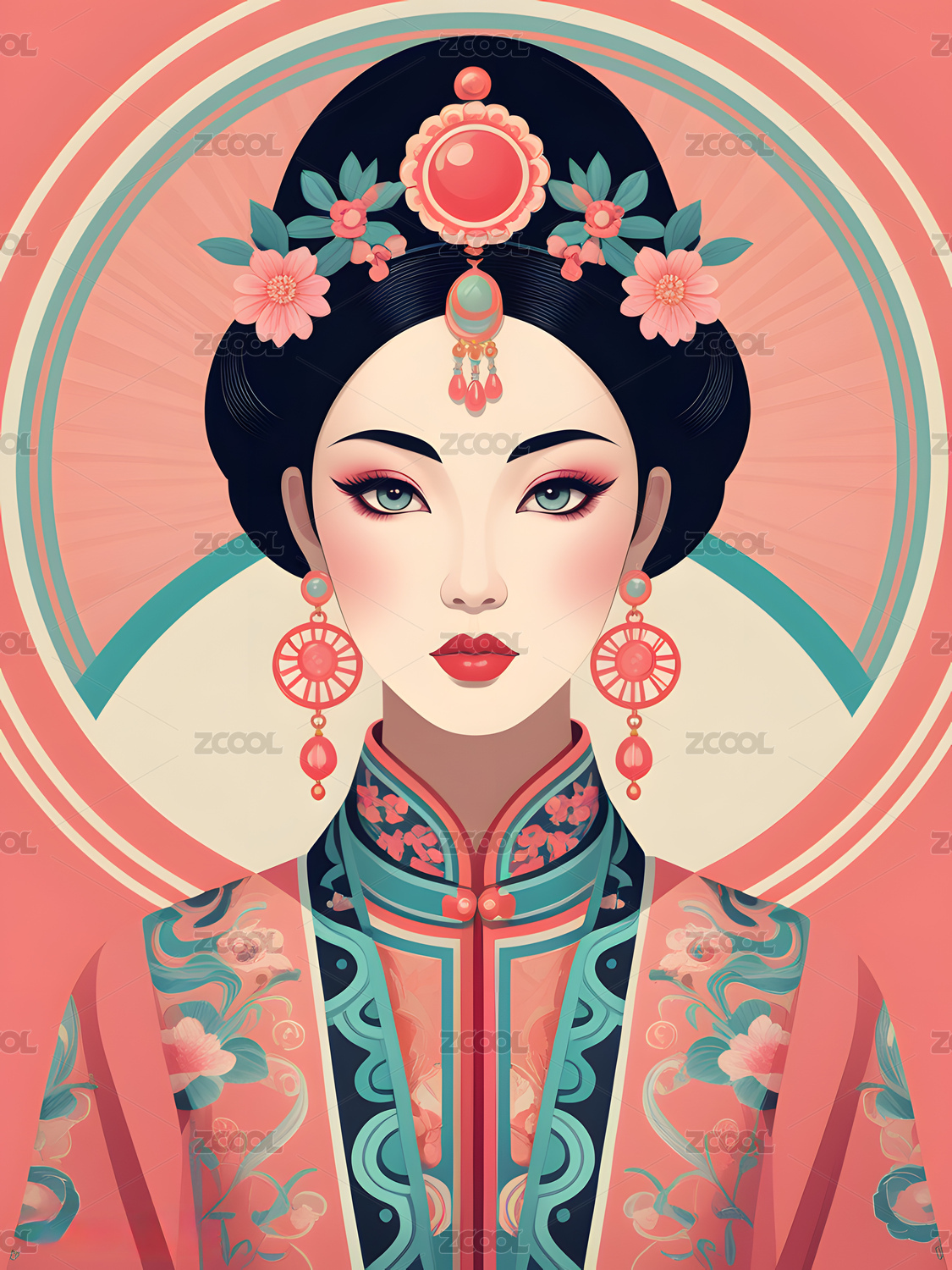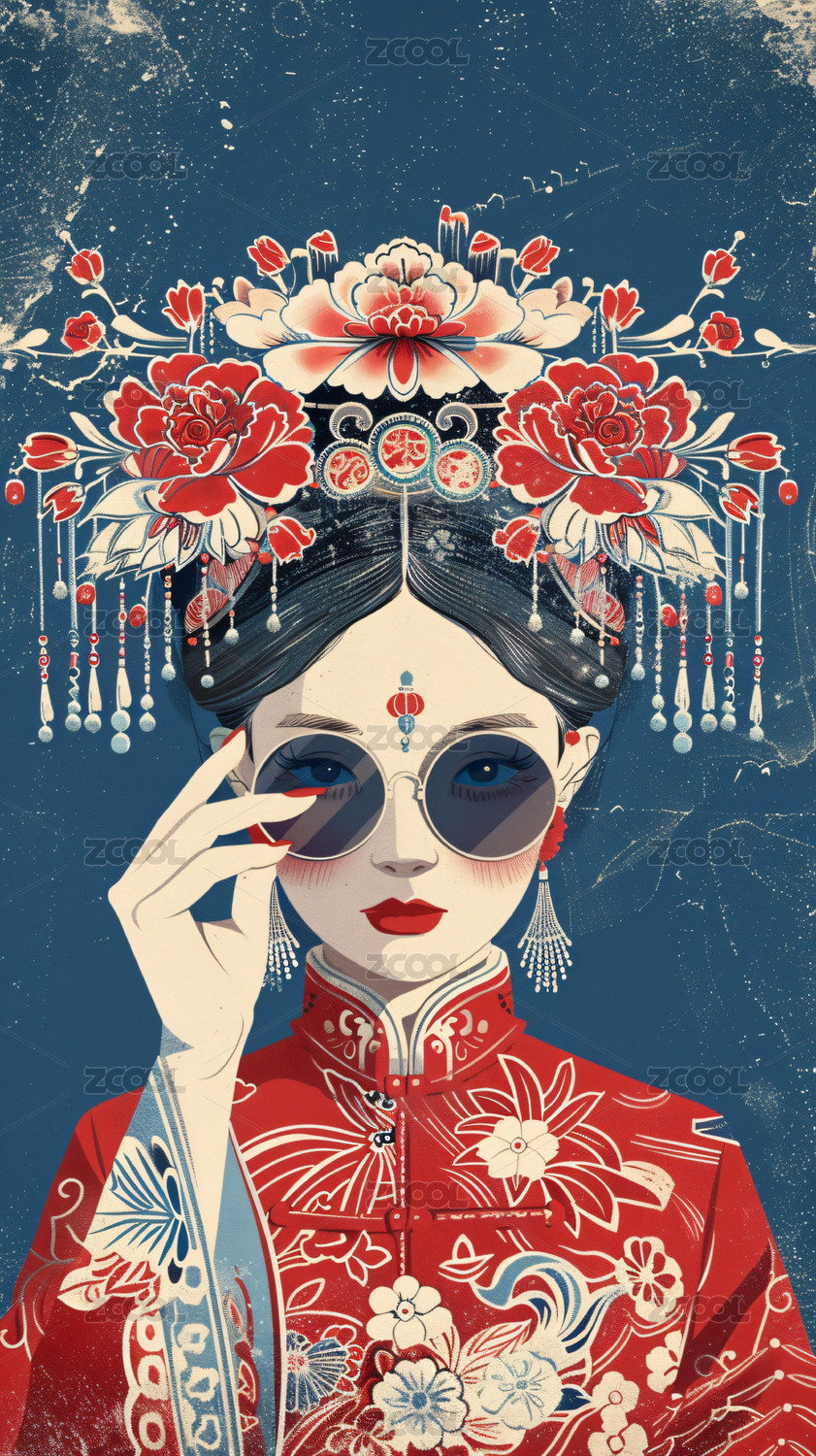 图像,AIGCFG,插画,红色,新中式风格,中国文化,国潮风,太阳镜,扇子,少女