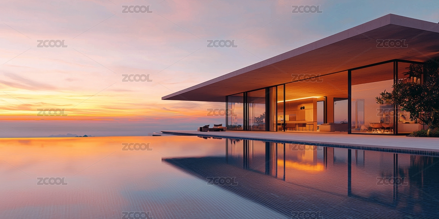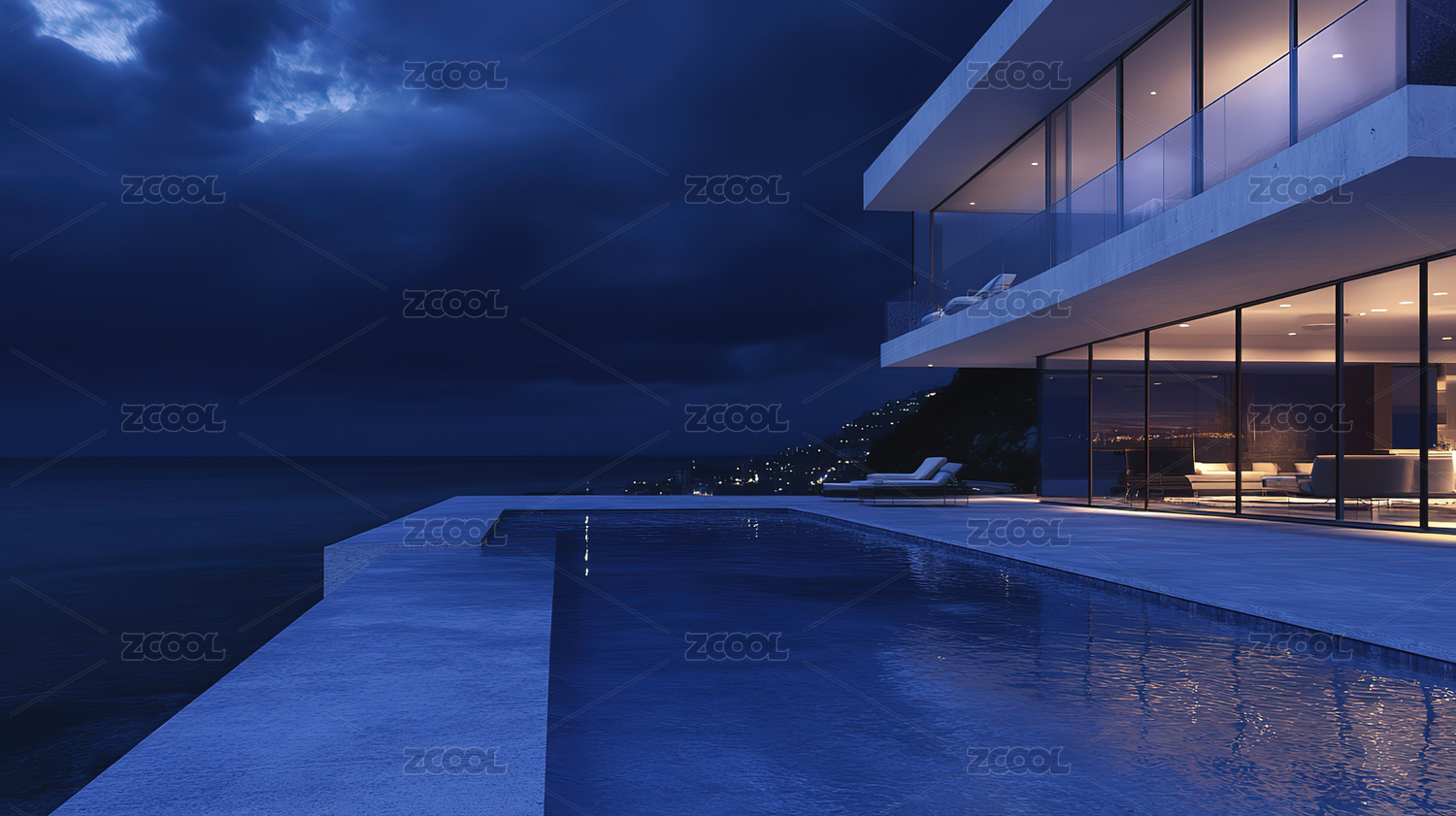图像,AIGC202401,建筑外部,反射,房屋,旅游目的地,蓝色,建筑,黄昏,游泳池