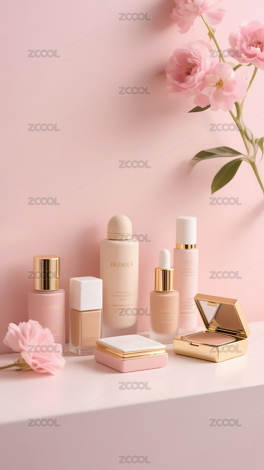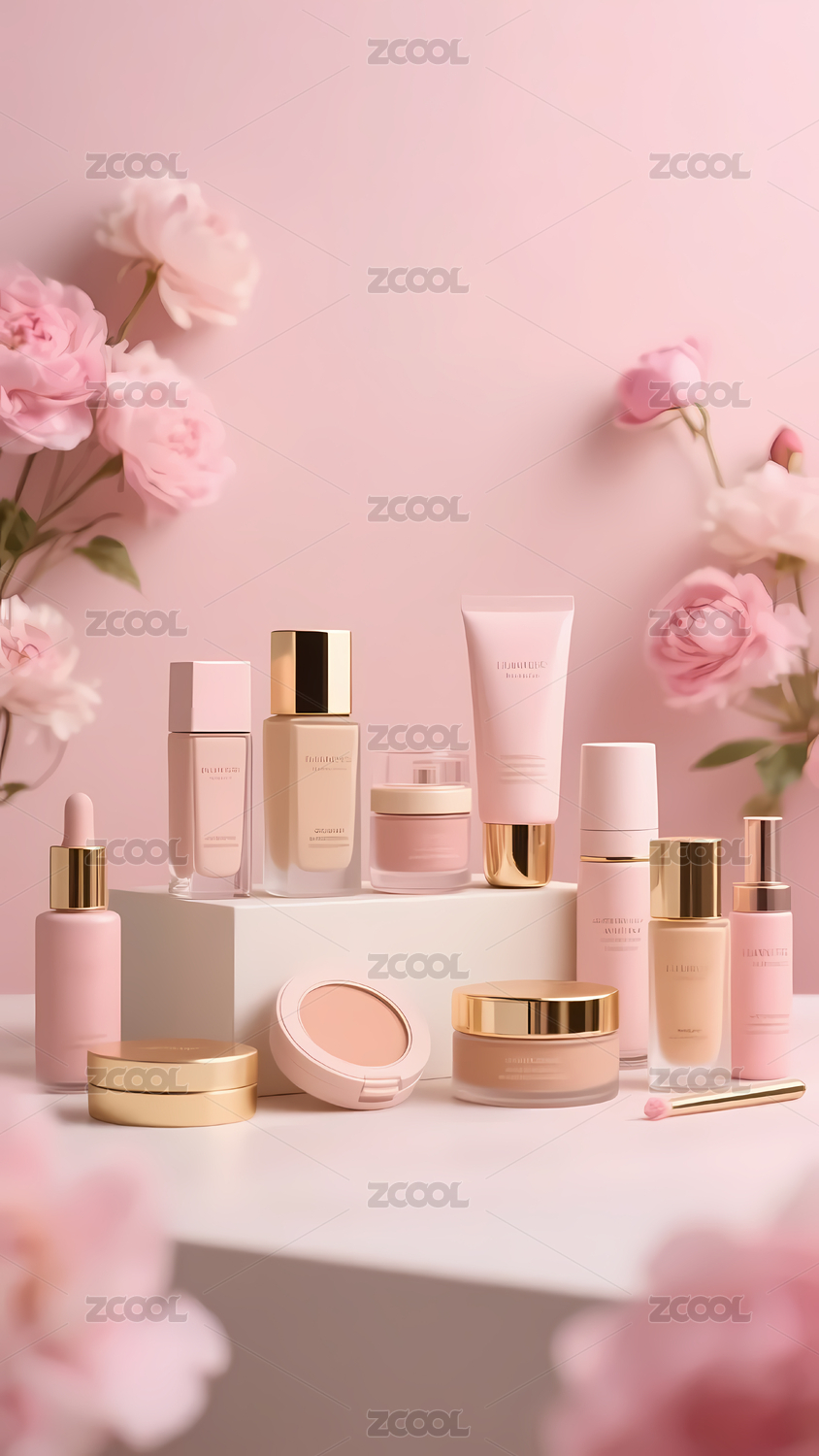 粉色花朵背景下的化妆品展示