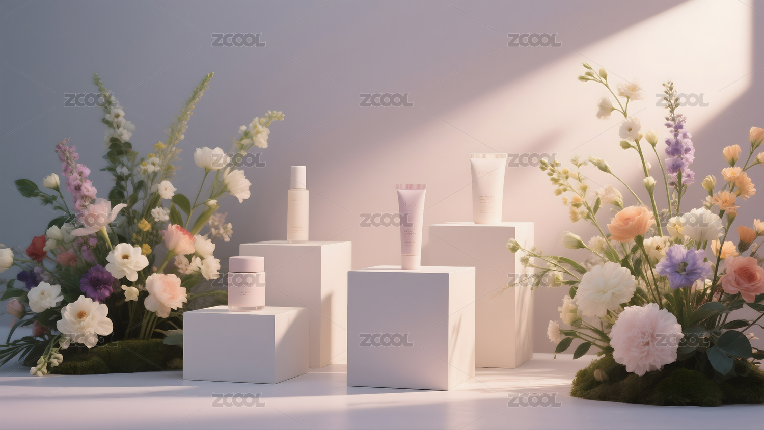 美容产品与鲜花布景