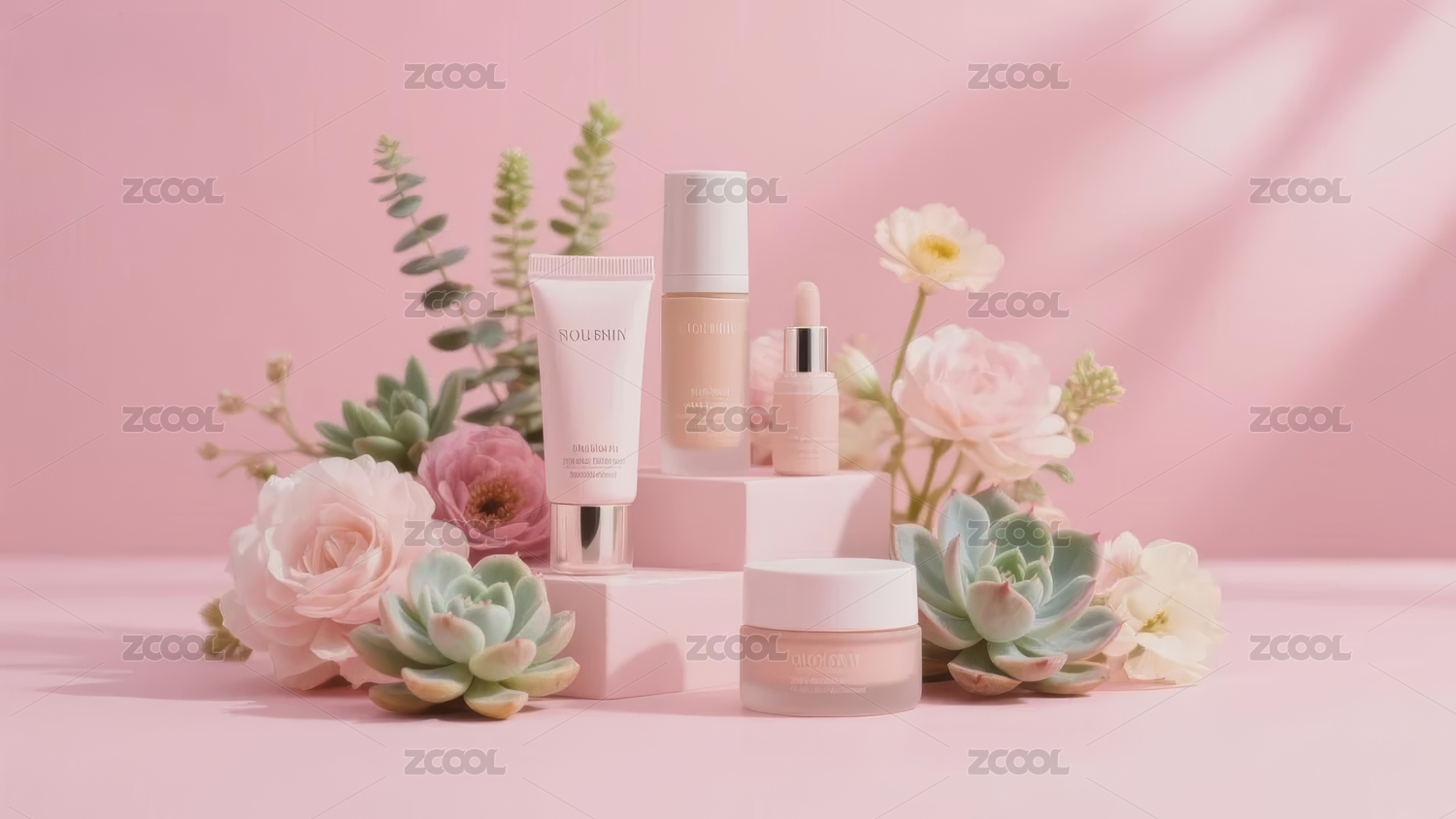 柔和的桃色护肤品套装展示