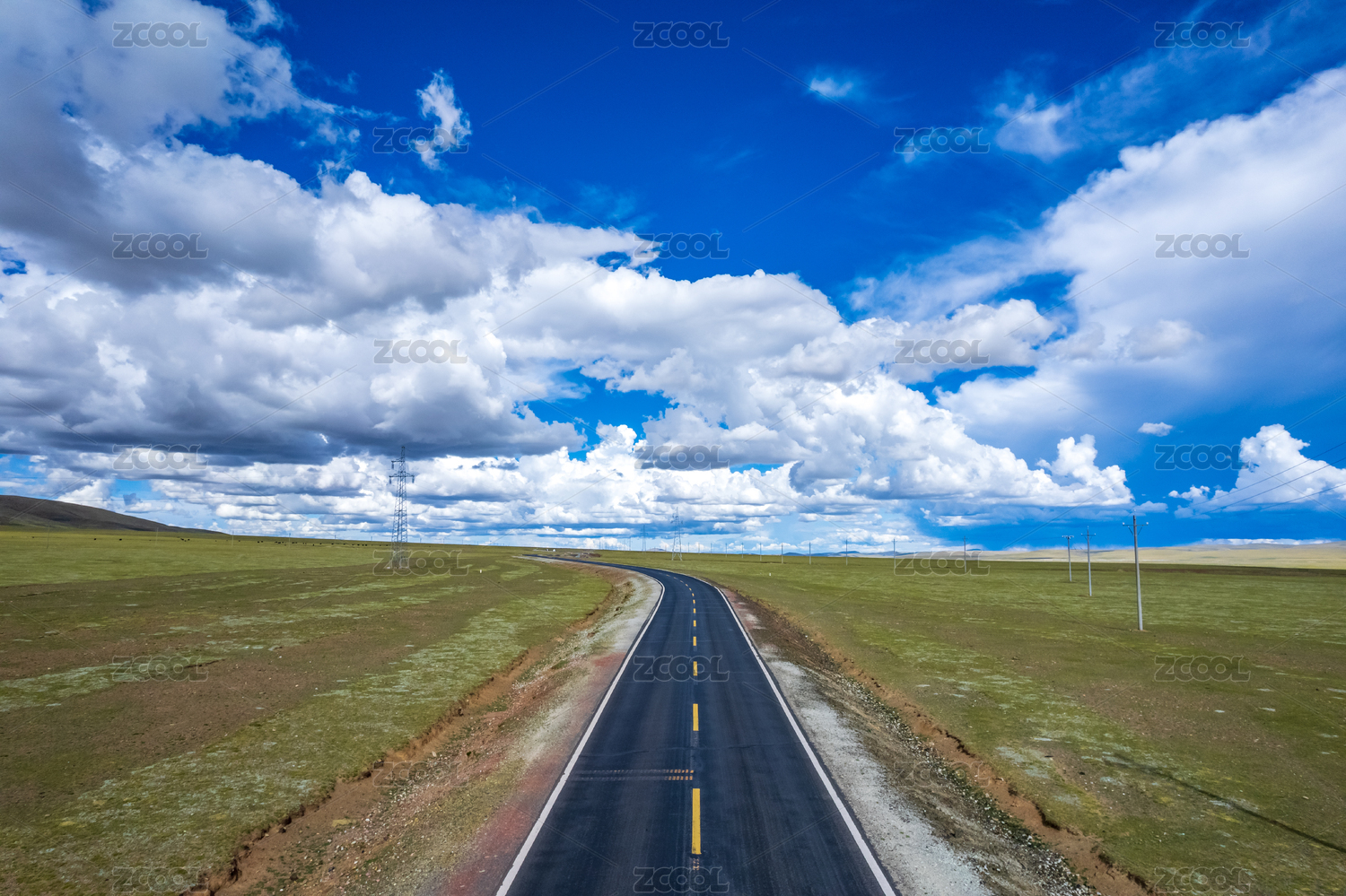 草原上的公路和天空的白云