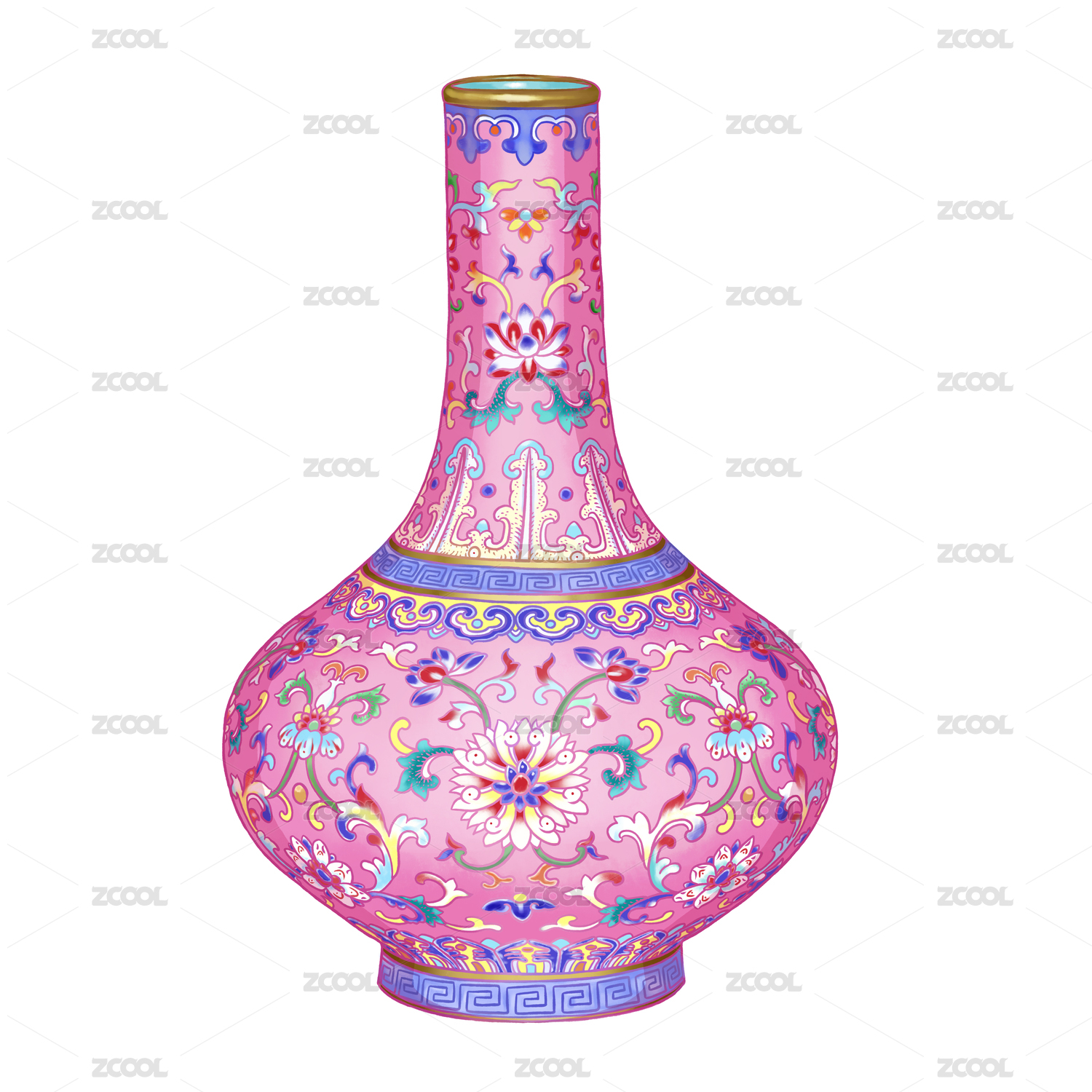 嘉庆粉地粉彩缠枝莲纹直口瓶手绘文物插画
