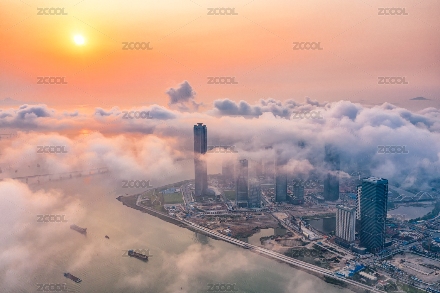 中国广东省珠海市横琴CBD日出云海风光航拍