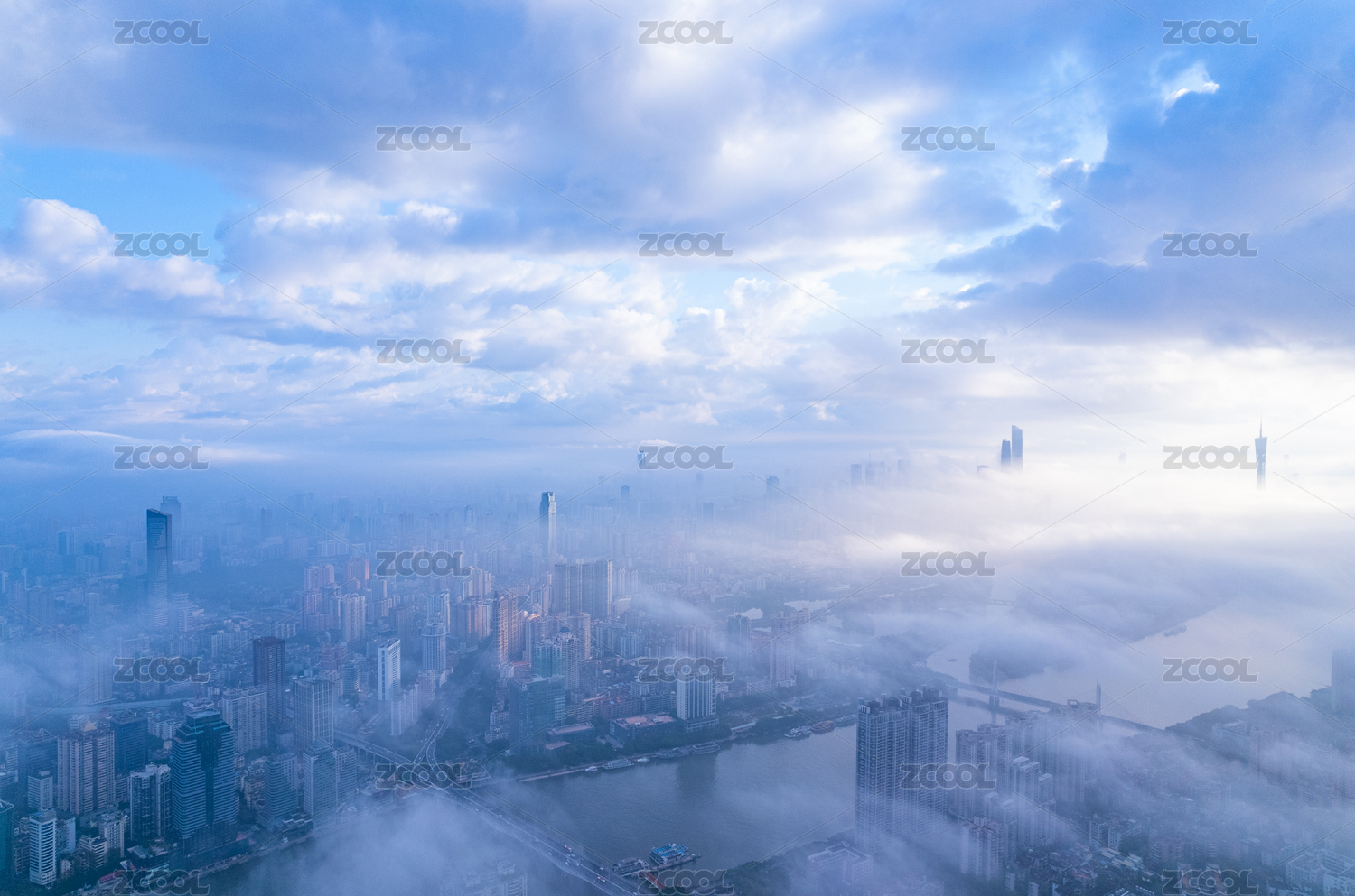 广州珠江岸城市高楼与云雾缭绕风光航拍