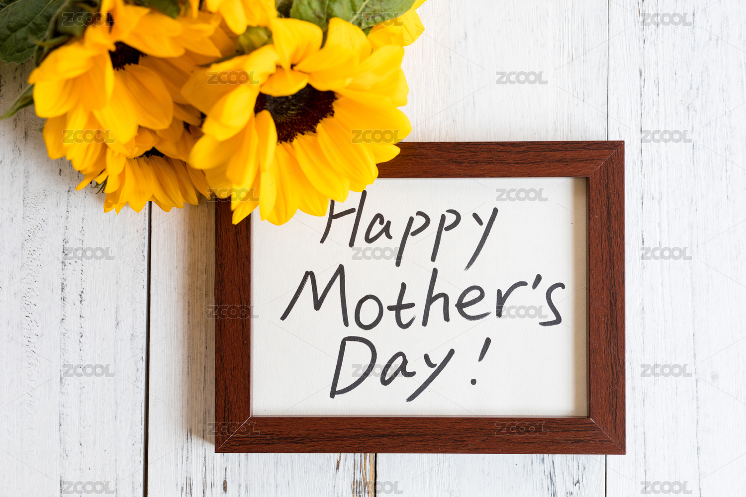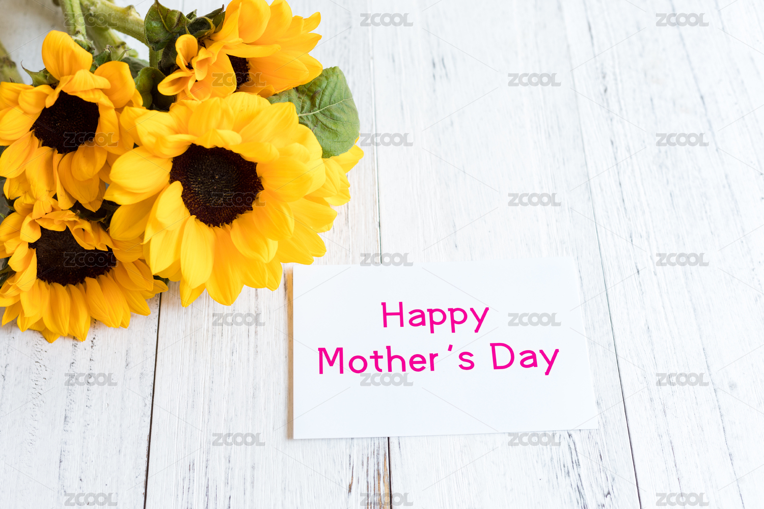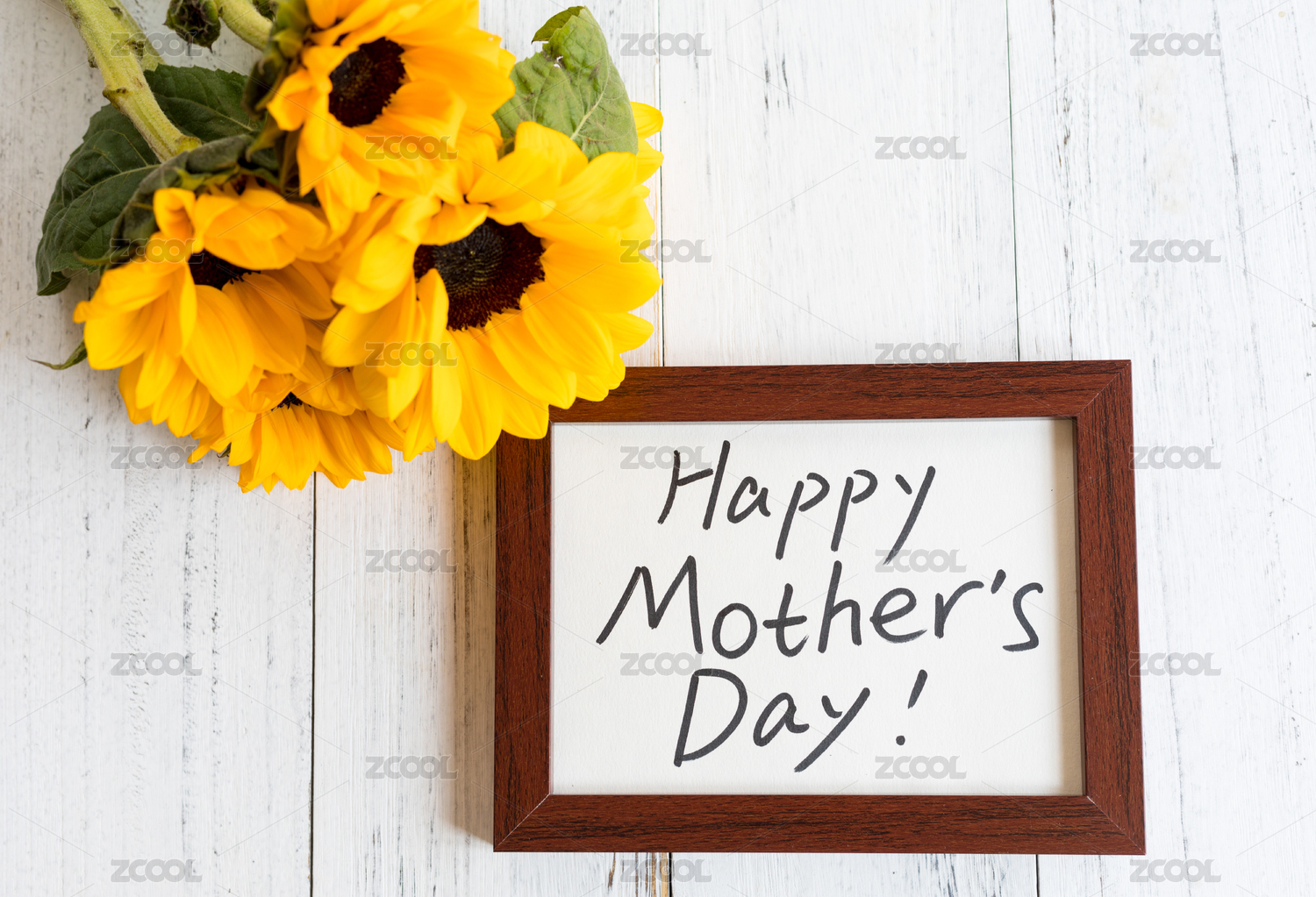 木纹桌面上的向日葵和母亲节贺卡
