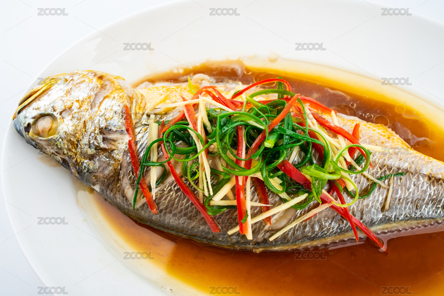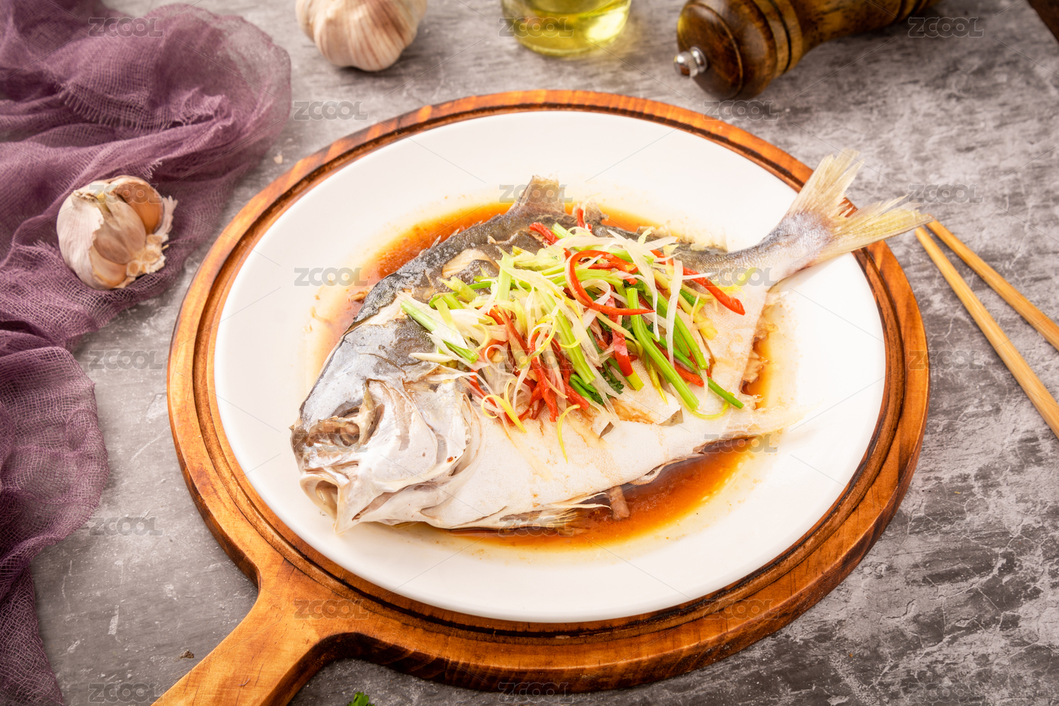 厨房台面上一道烹饪好的中国菜清蒸金鲳鱼