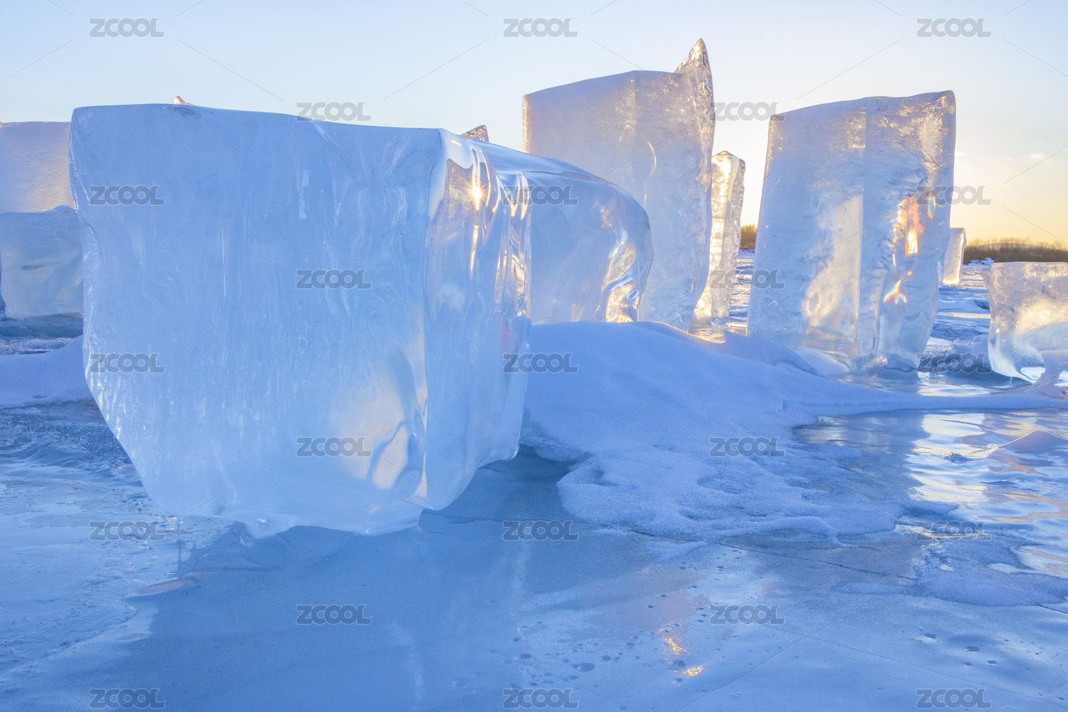 中国内蒙古自治区大兴安岭加格达奇区甘河上的冰块霞光