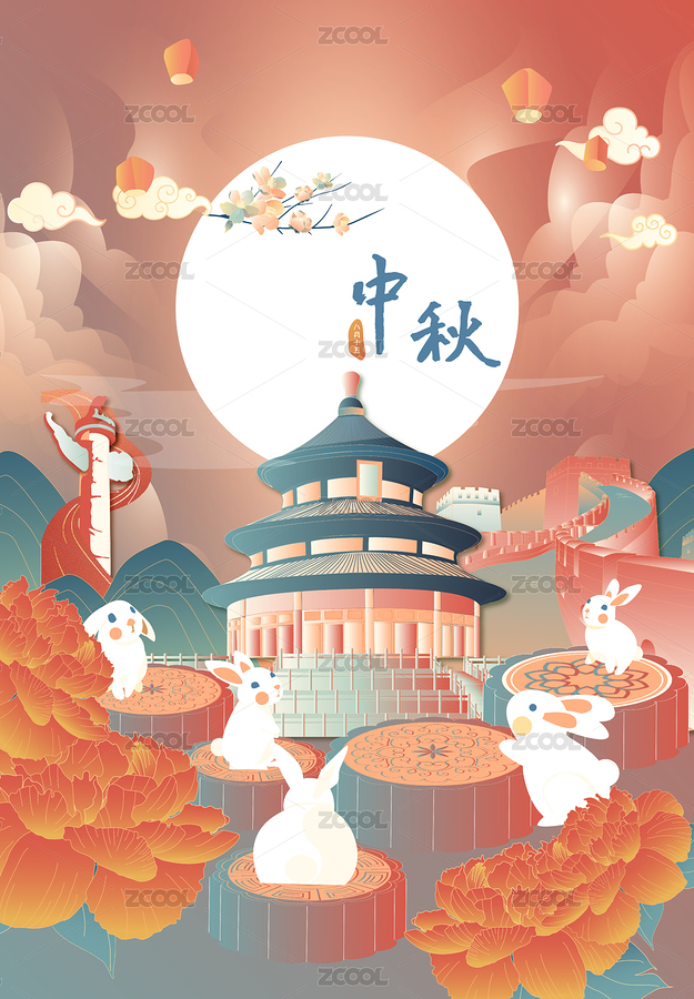 中秋节嫦娥月亮宫殿花灯桂花祥云山牡丹花国潮插画