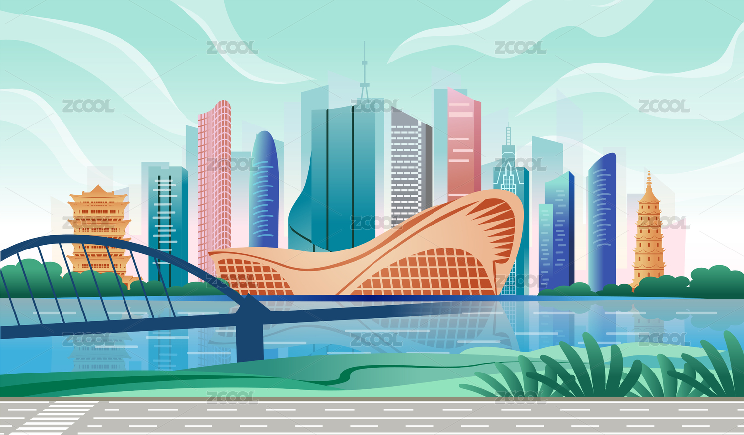 中国浙江绍兴市商务科技城市彩色矢量插画