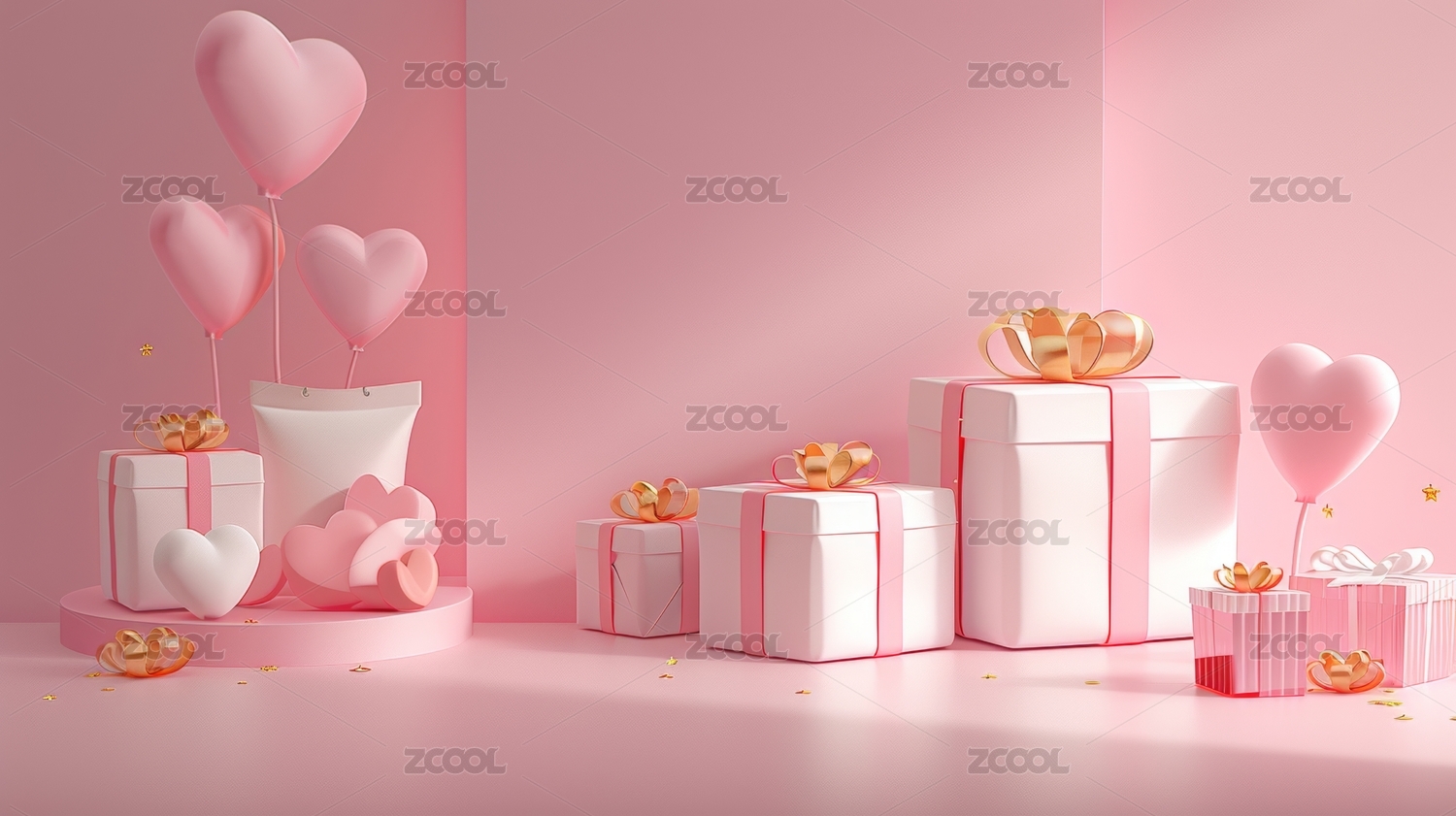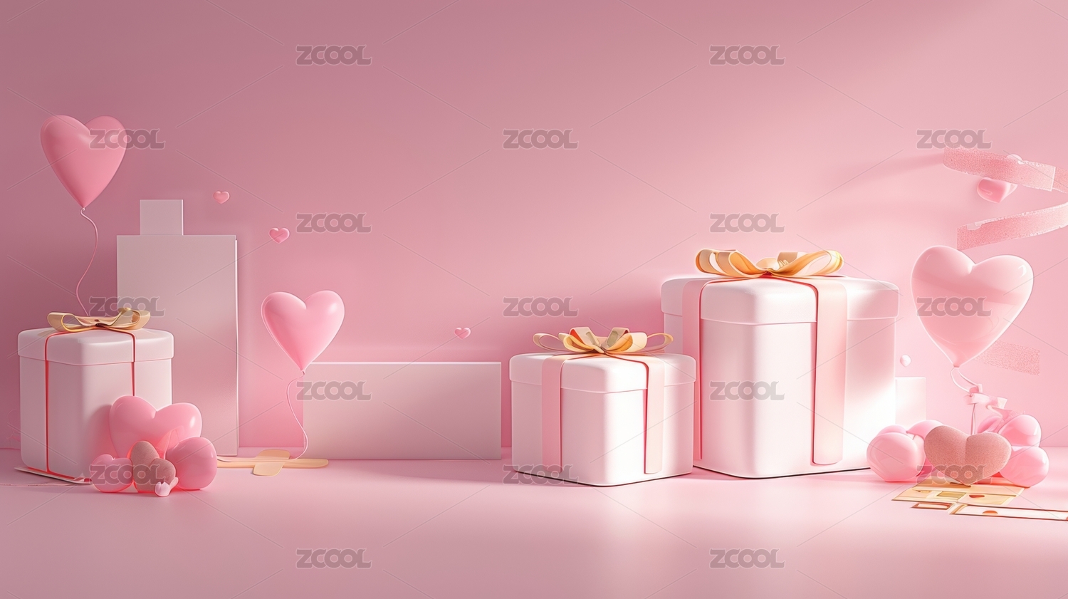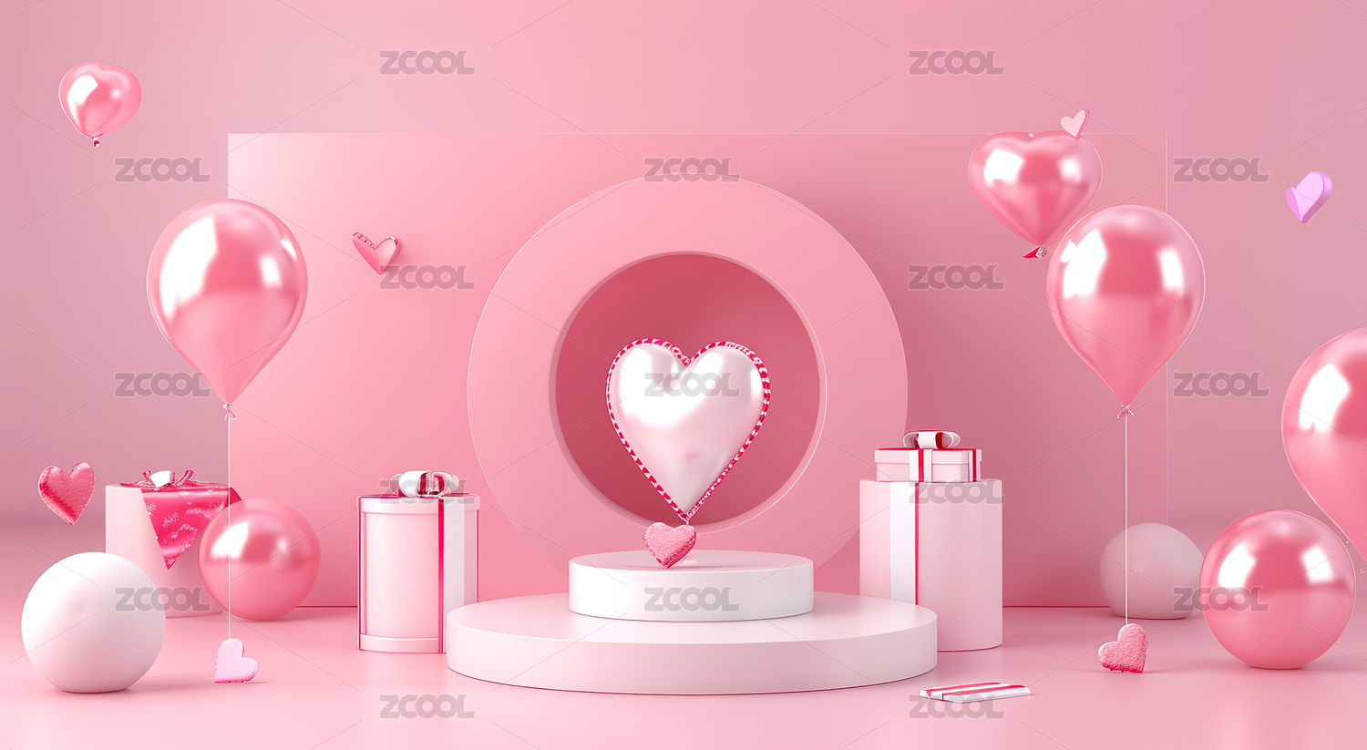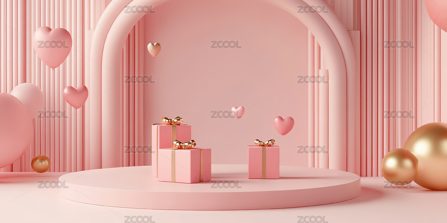 粉色,礼品盒,三维,虚拟空间,心形,气球,展示台,情人节,七夕,电商