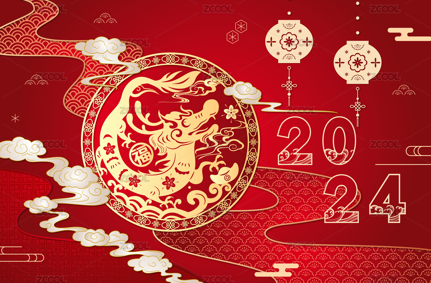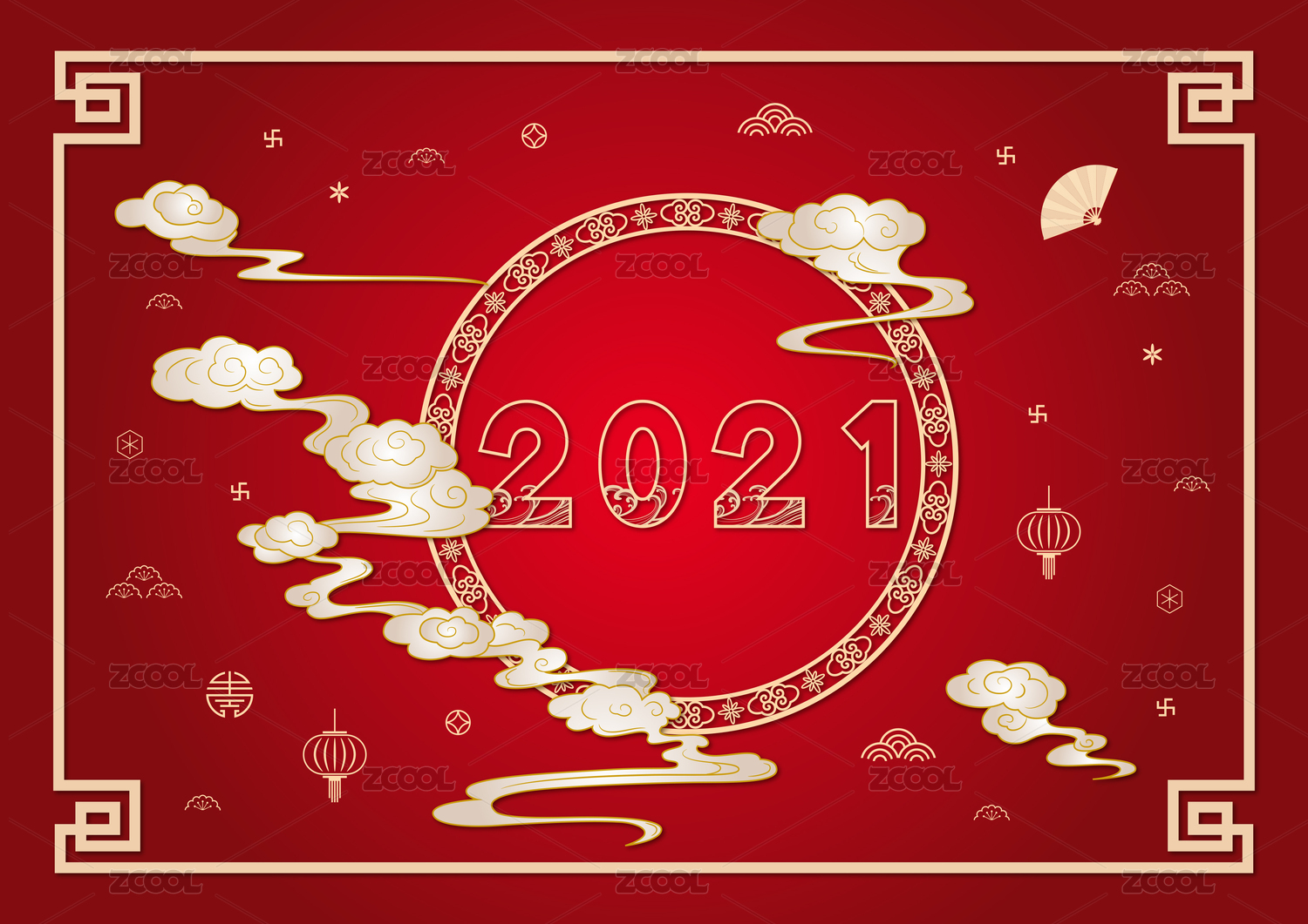 牛年新年中国风剪纸牛与云纹灯笼背景