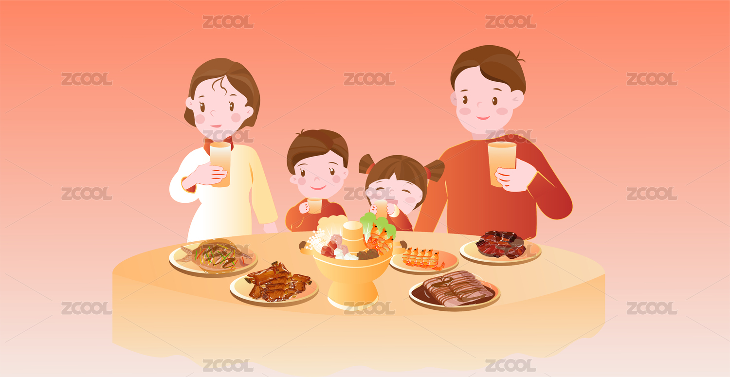 卡通新年春节年夜饭团圆饭吃饭家人团圆背景矢量插画