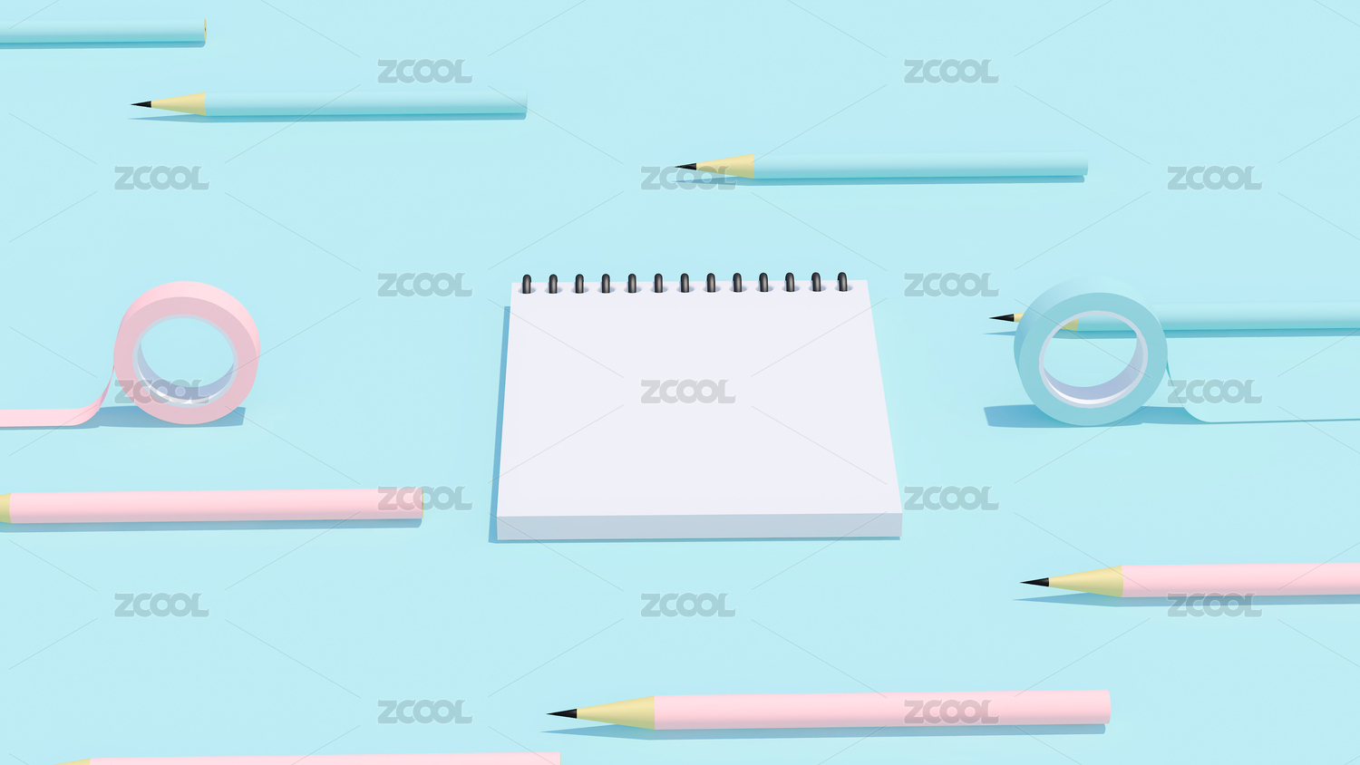 各类文具与白色背景 3D渲染