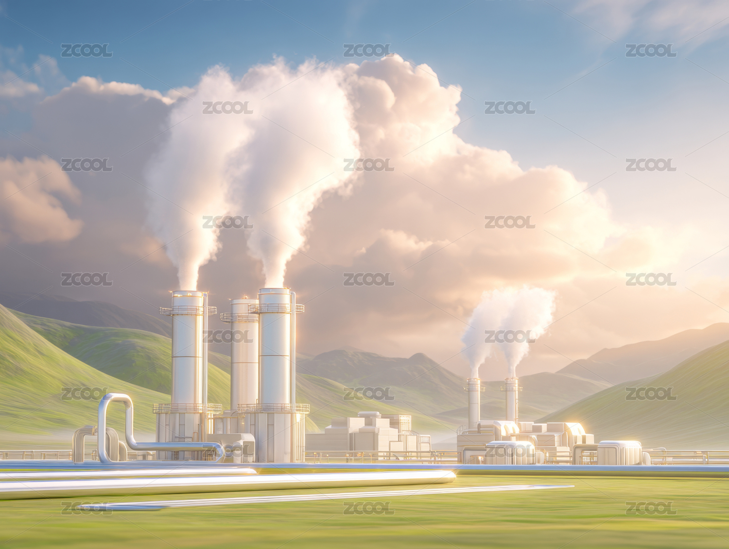 夕阳下的烟囱冒出的烟在天空中的剪影