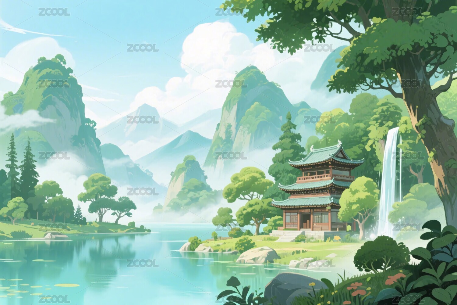 山水古建风景插画