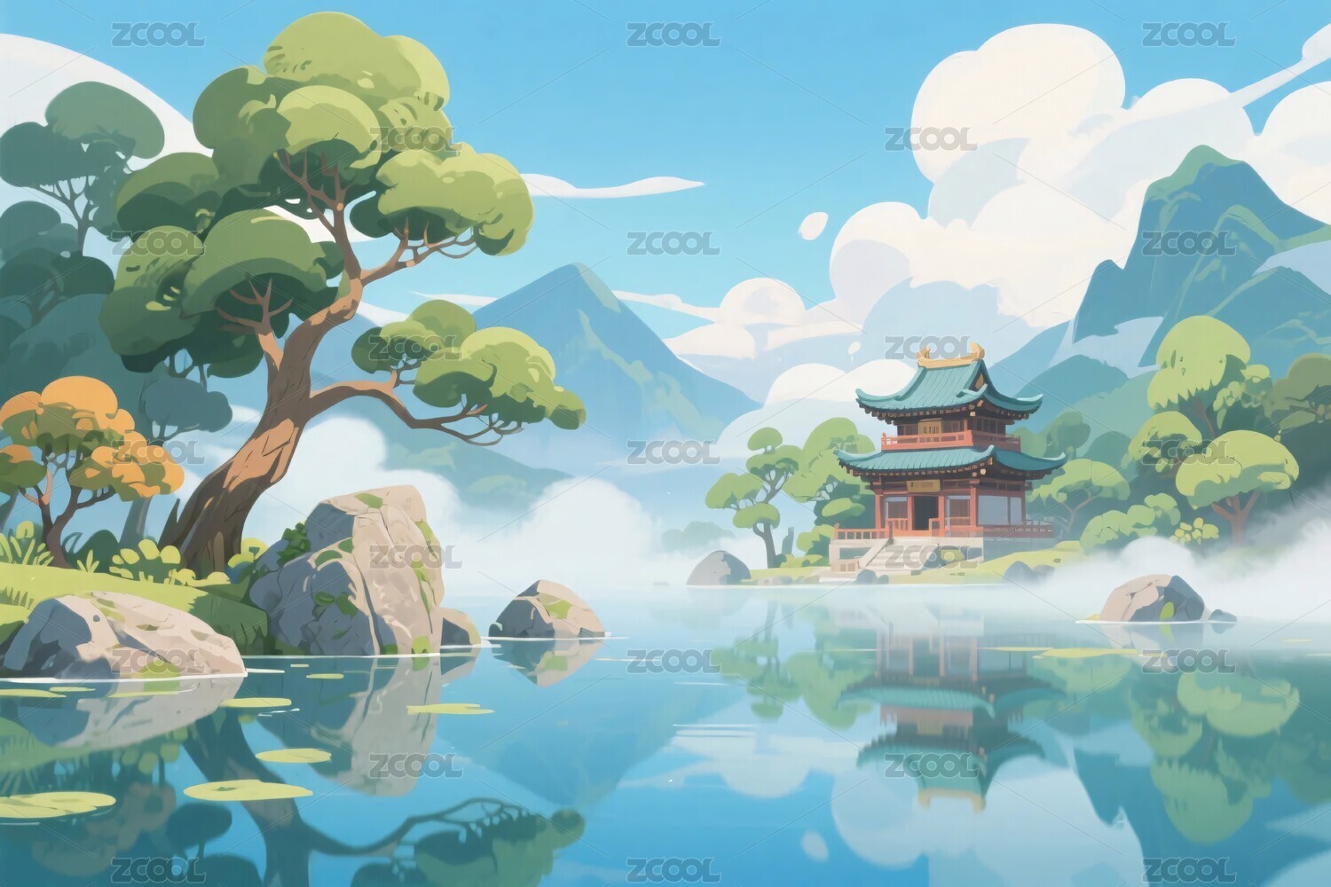 中国风山水湖泊亭子风景插画