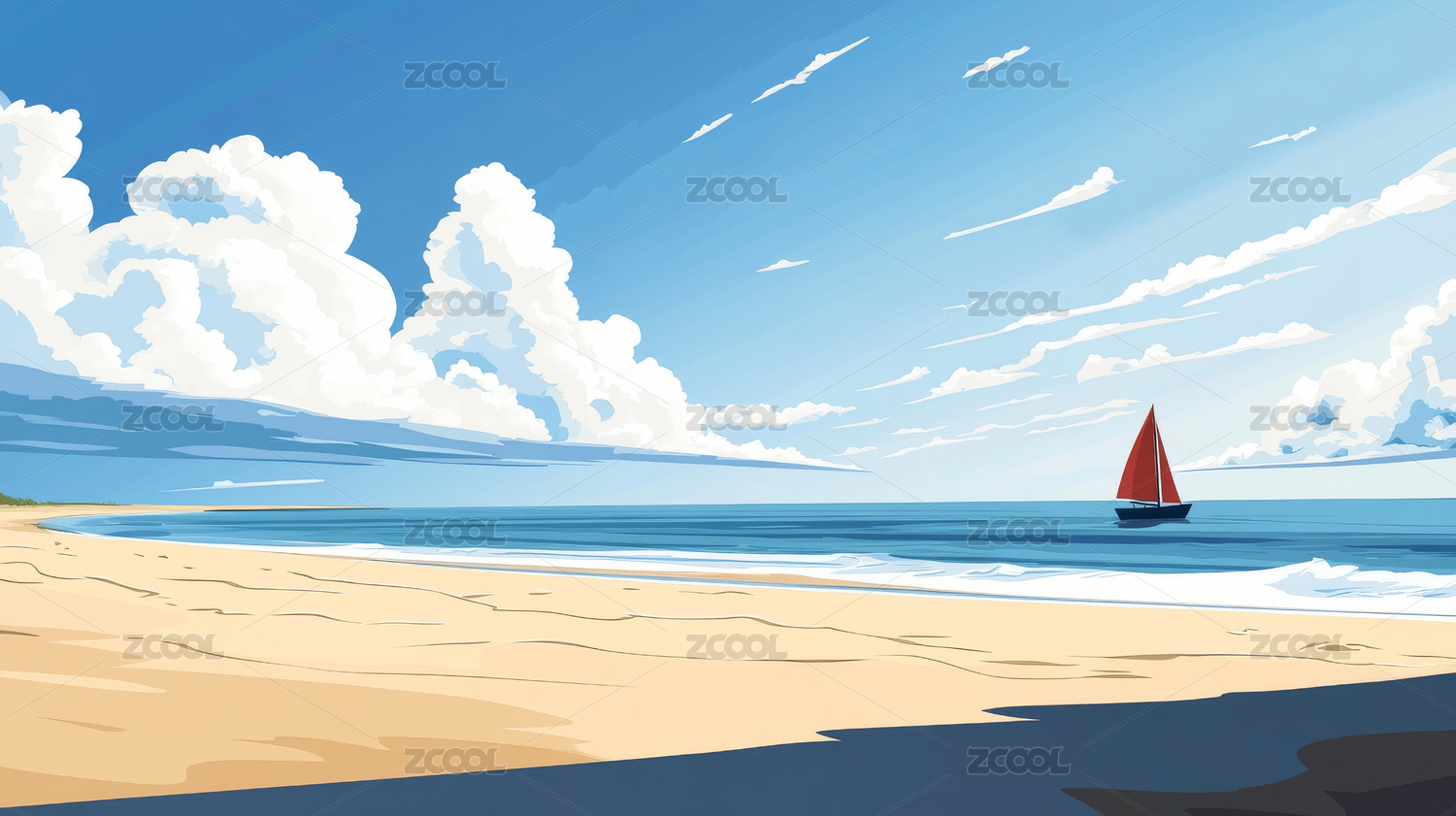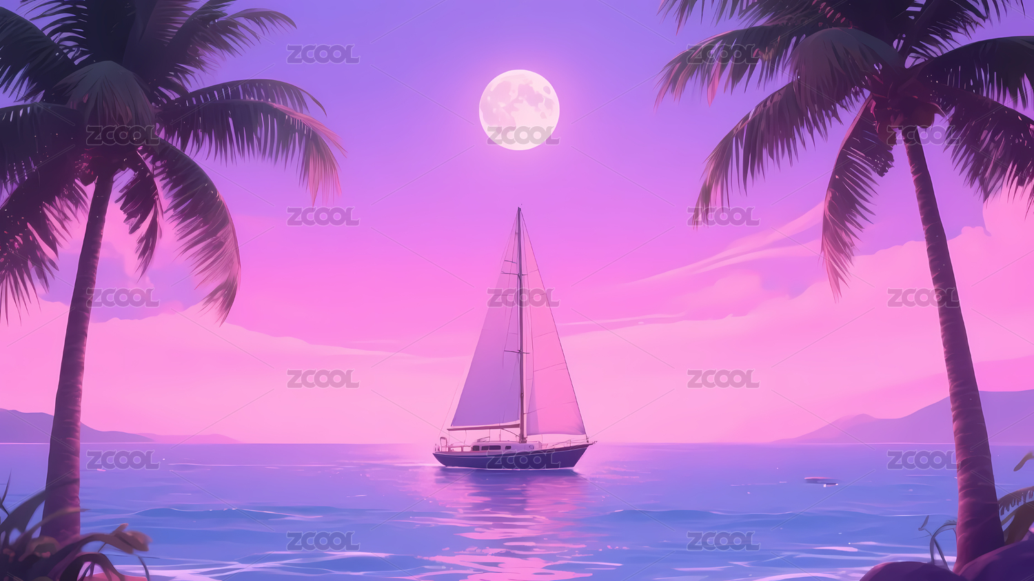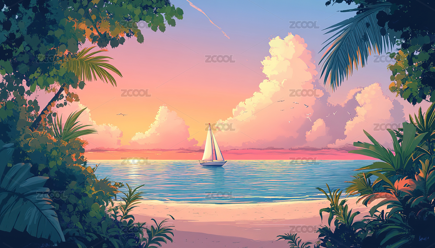 日落,夕阳,大海,帆船,沙滩,海洋,蓝天,白云,椰树