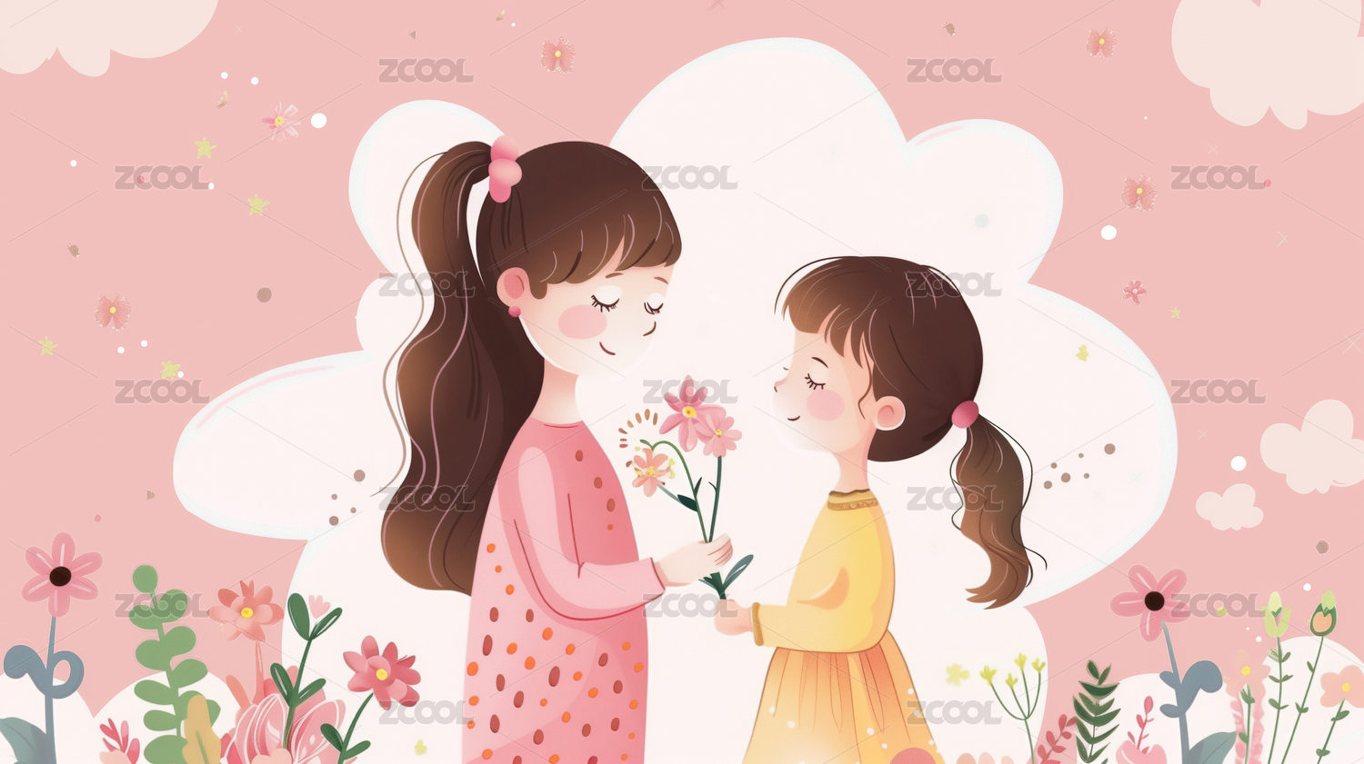 母亲节,妈妈,温馨,植物,肌理,插画,康乃馨,人物,治愈,母女