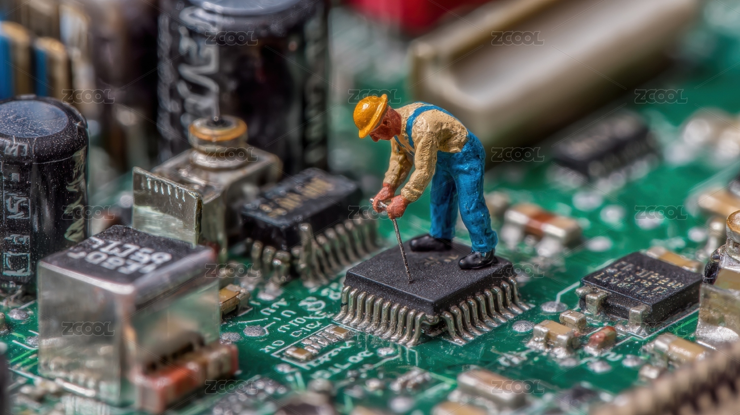 电子元件主板与工人人偶场景